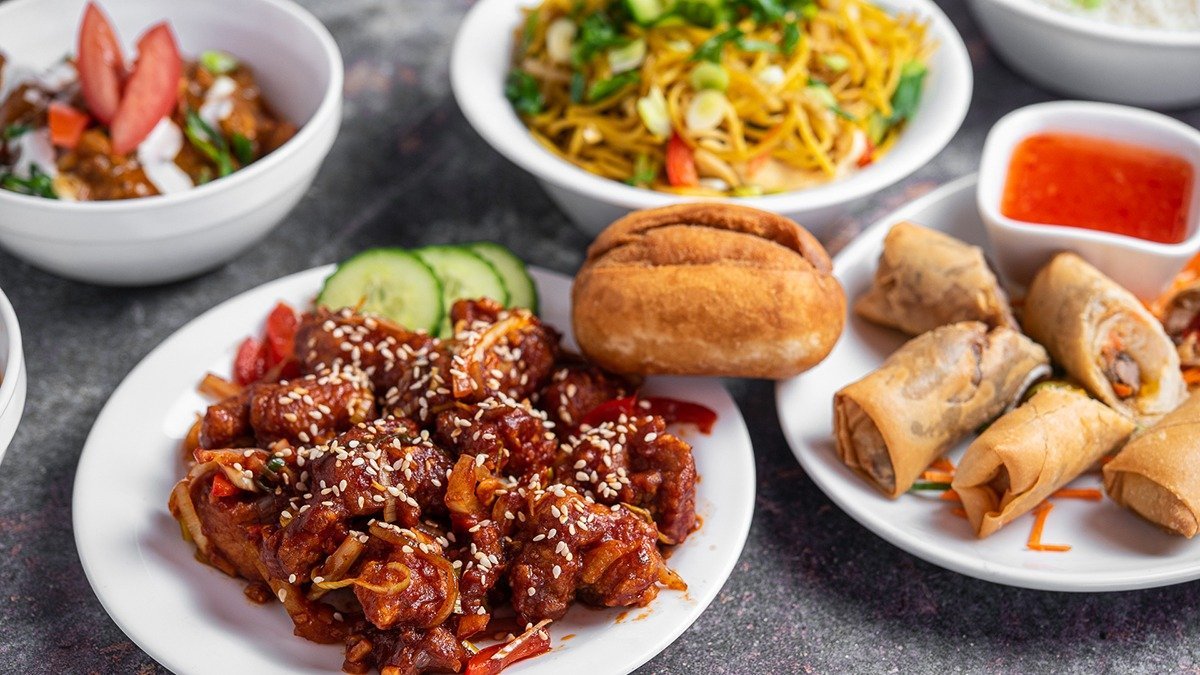 Asian Authentic food. Currys, spring rolls, and noodles.