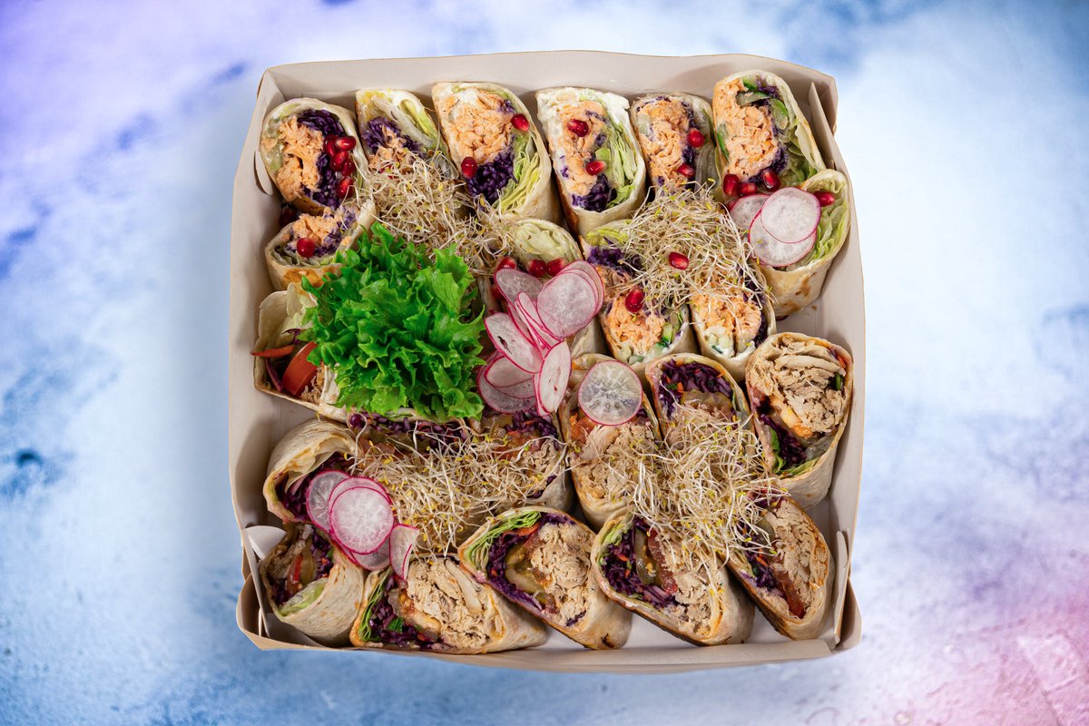 Täistera tortilla, rebitud kanaliha, feta juust, jääsalat, punane kapsas, värske kurk, tomat, punane sibul, jogurti-ürdikaste Toiteväärtus: 375 kcal (SV: 36,1/ V: 34,2/ R: 9,1)