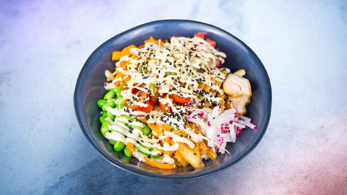 Soe riis, rebitud kanaliha, mango-avokaado-paprika salsa, kirsstomatid, punane kapsas, marineeritud porgand, roheline salat, maapähkli furikake, bopp sriracha majonees, redis, idud Toiteväärtus: 701 kcal (SV: 48/ V: 31,8/ R: 41,2) Toiteväärtus muutub kui vahetada kaste jogurti-ürdikastme vastu või valida riisi asemel suvikõrvitsa nuudlid.