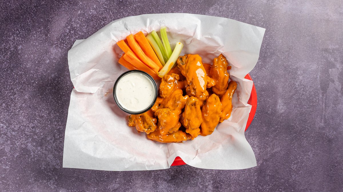 Maitsvad frititud kanatiivad, mida serveeritakse koos teie valitud kastme ja dipiga