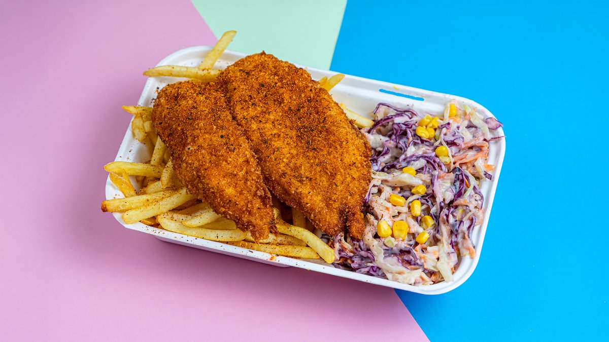 krõbe kanafilee, friikartulid, coleslaw salat, kaste