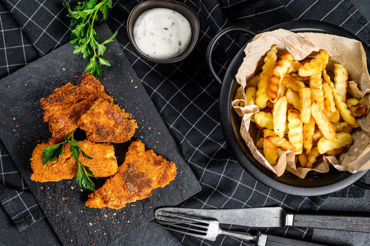 Praetud kanafilee friikartulitega, serveeritud kastmega