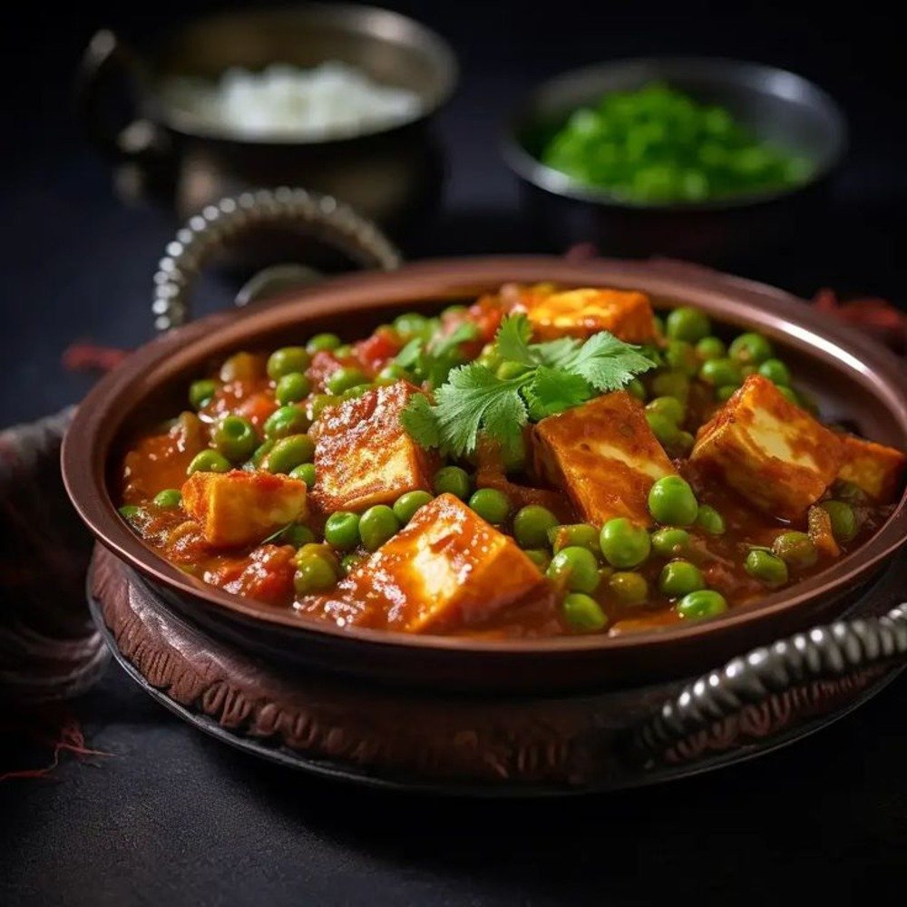 Mater & paneer keedetud karrikastmes, serveeritud riisiga