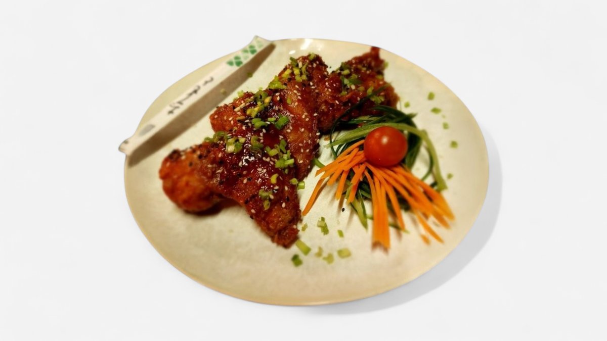 Krõbedad kanatiivad Korea grillikastmes, peal roheline sibul ja seesamiseemned