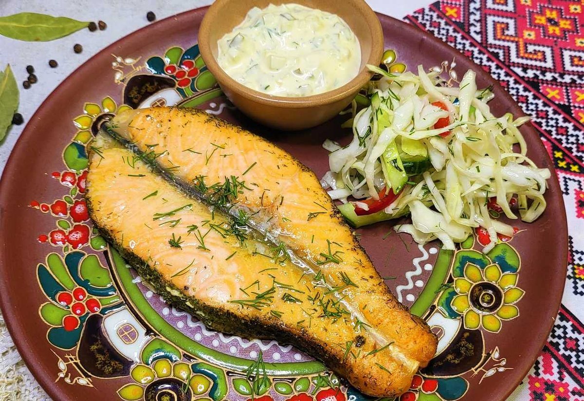 Lõhe, rõõskkoor, majonees, marineeritud kurk, maitseroheline