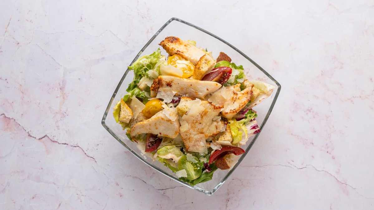 Salati põhi, Caesari kaste, kirsstomatid, parmesan, krutoonid + kanafilee