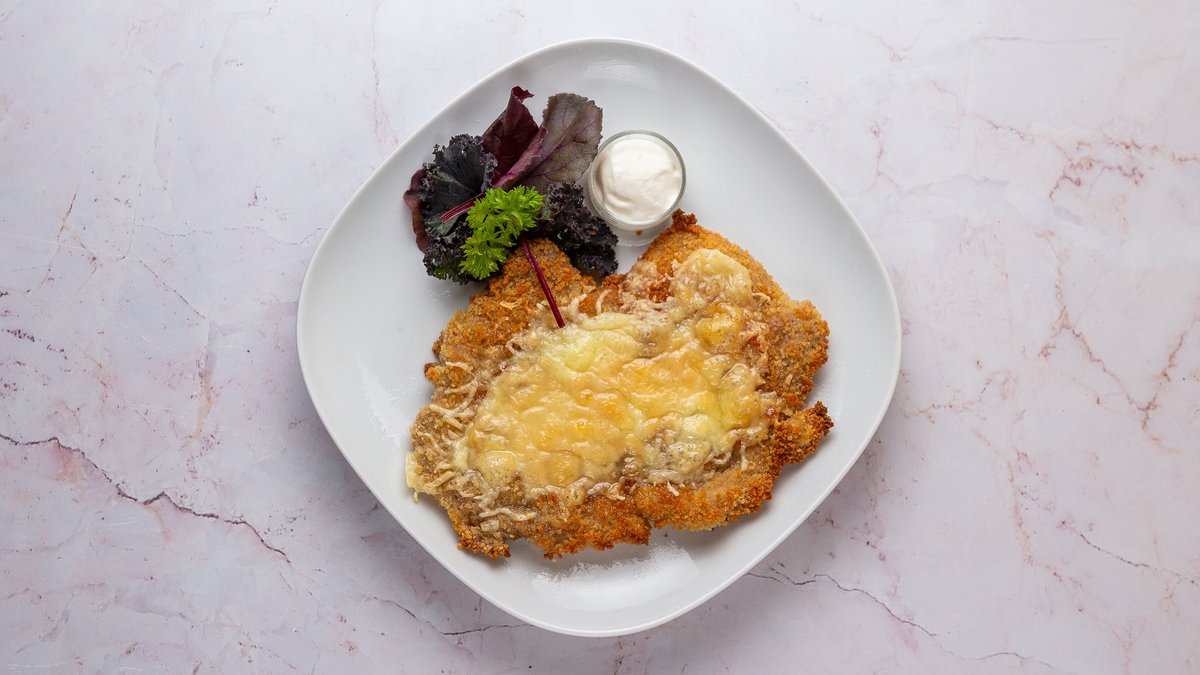 Paneeritud kaelakarbonaad küpsetatud ahjus, parmesani ja riivjuustu katte all. Lisand kliendi valikul