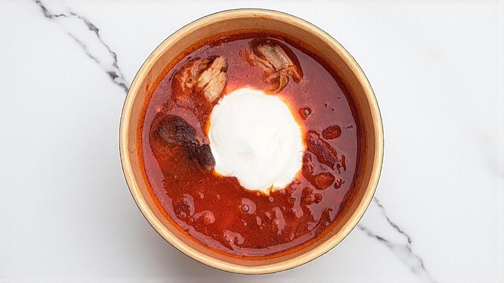 Peet, kapsas, kartul, sibul, porgand, searibid, tomat. Serveeritakse hapukoore, soolapeki .