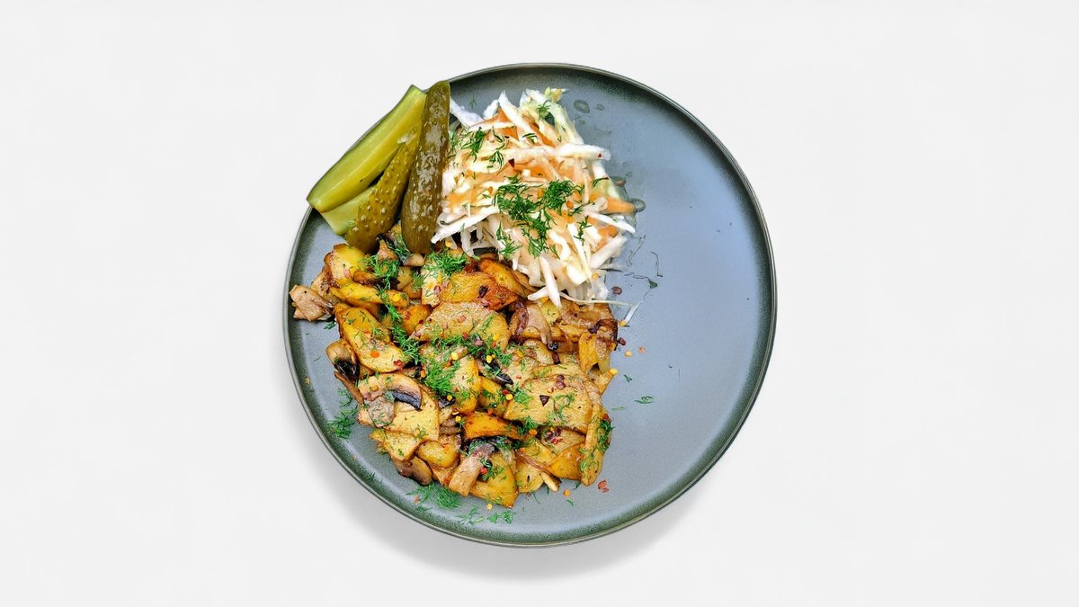 Sink, suitsukana, vorstid, marineeritud kurgid, sibul, sidrun, oliivid. Serveeritakse hapukoore ja ürtidega.