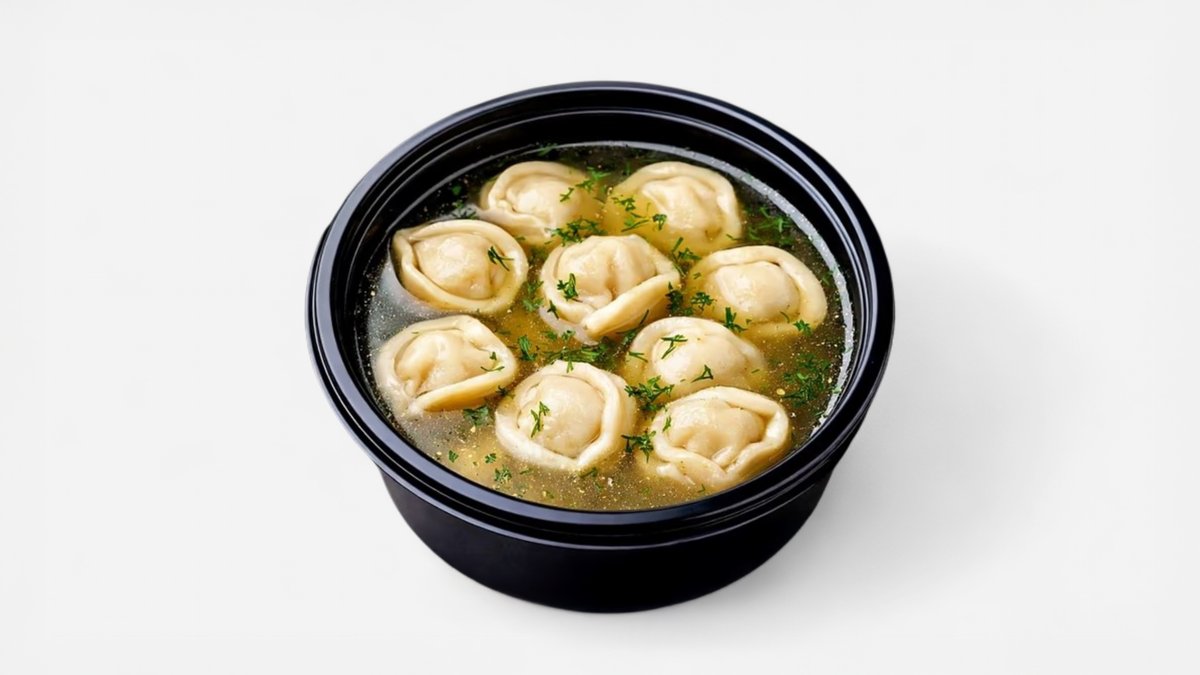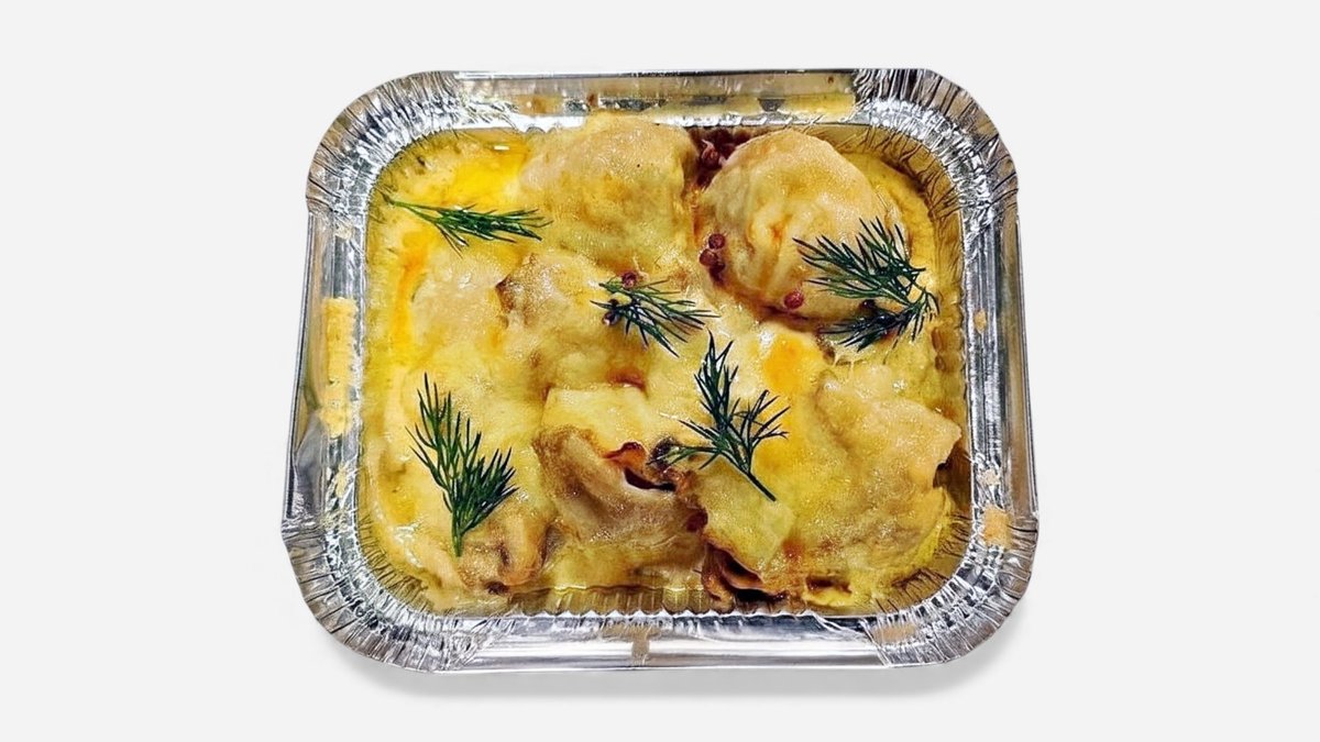 Mahlased pelmeenid, küpsetatud õrnas koore-seenekastmes ja juustukoorikuga