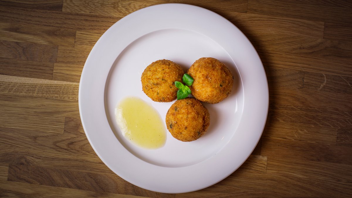 Friteeritud risotto pallid, trühvlikreem, gorgonzola juust, pirni püree 3pc