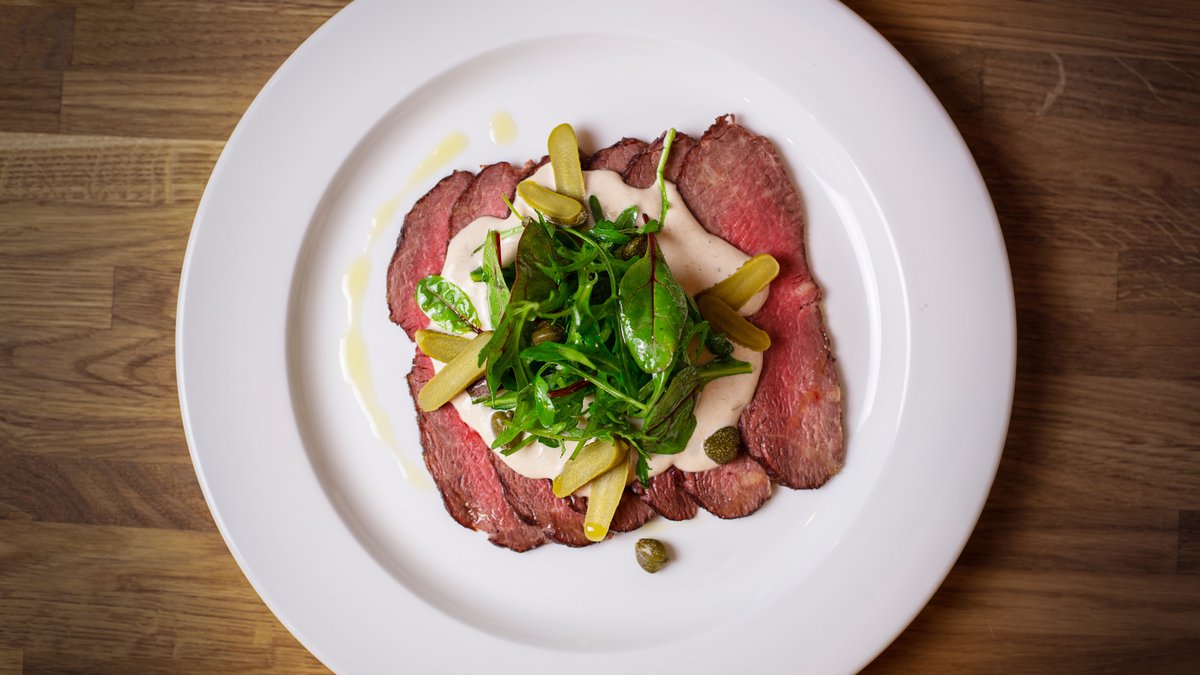 Veiseliha lõigud, tuunikala kaste, rukkola, mangold, kapparid, marineeritud kurgid