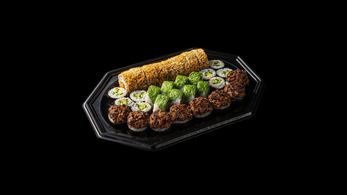 Caesar + Philadelphia + Krõmpsuva kana maki Krõmpsuva kana maki 8tk: krõmpsuv kana, philadelphia, salat, tomat, yakiniku kaste, seesam + Caesar 8tk: Caesari kaste, salat, tempura hiidkrevetid, tomat, seesam + Philadelphia 8tk: Avokaado, philadelphia, lõhe, seesam