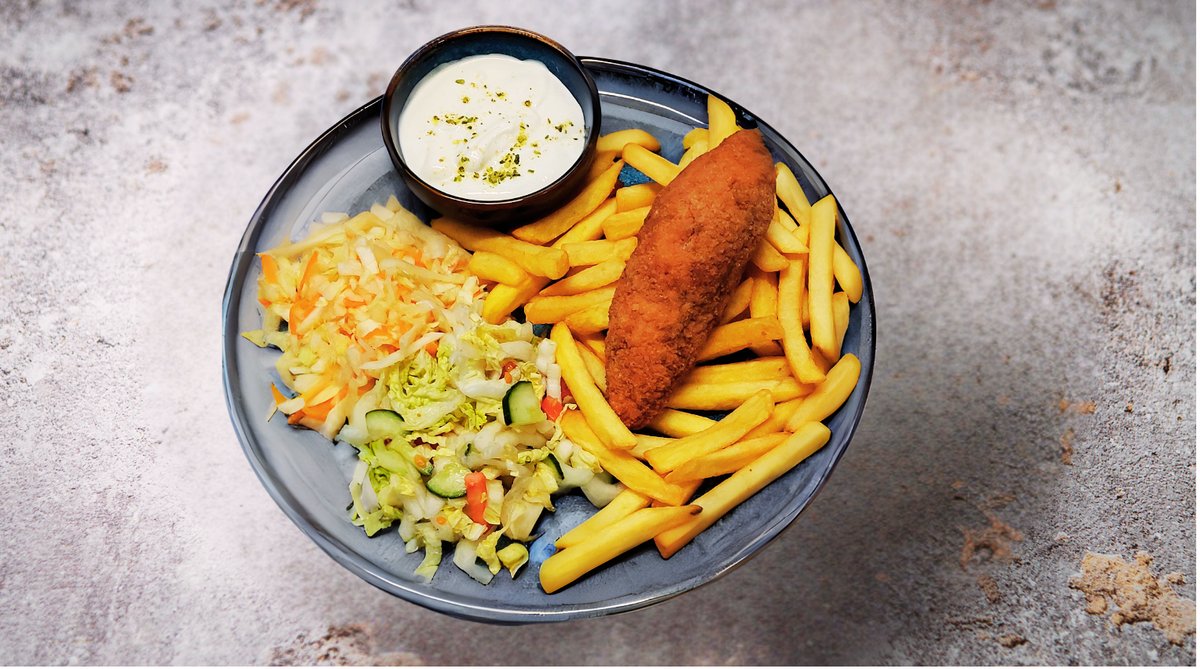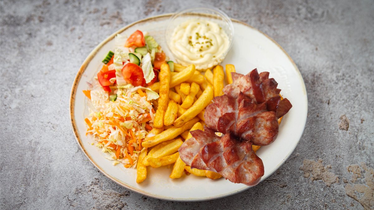 Suur kebab friikartulitega➕0.25l Red Bull Kebab kanalihast, kartul, marineeritud sibul, värske salat (maisi, tilli ja sibulaga), kaste *MAHE- tillikaste ja BBQ *TERAV- jalopeno, küüslaugukaste, salsakaste