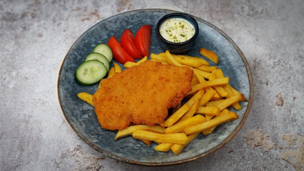 Paneeritud kanafilee, tomat, kurk, kartul, sidruni-ürdi kaste