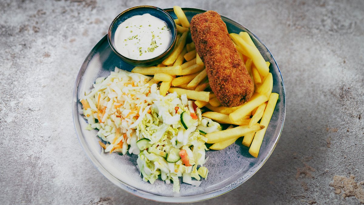 Paneeritud kanafilee rull juustuga, katul, kapsa-porgandi salat, värske salat, kaste