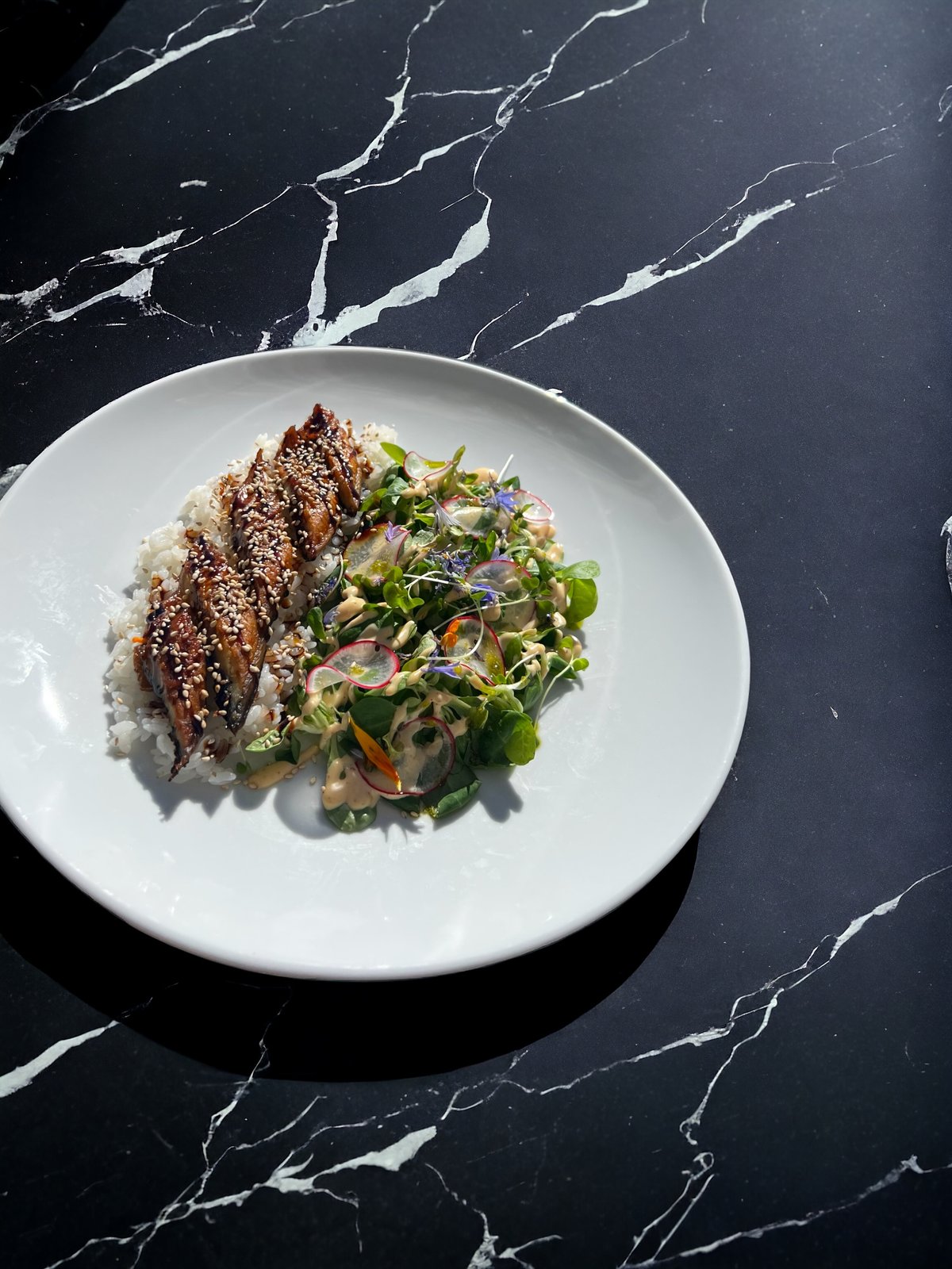Sees: toorjuust, kurk, tempura krevett Peal: põletatud lõhe, unagi kaste, valge seesam