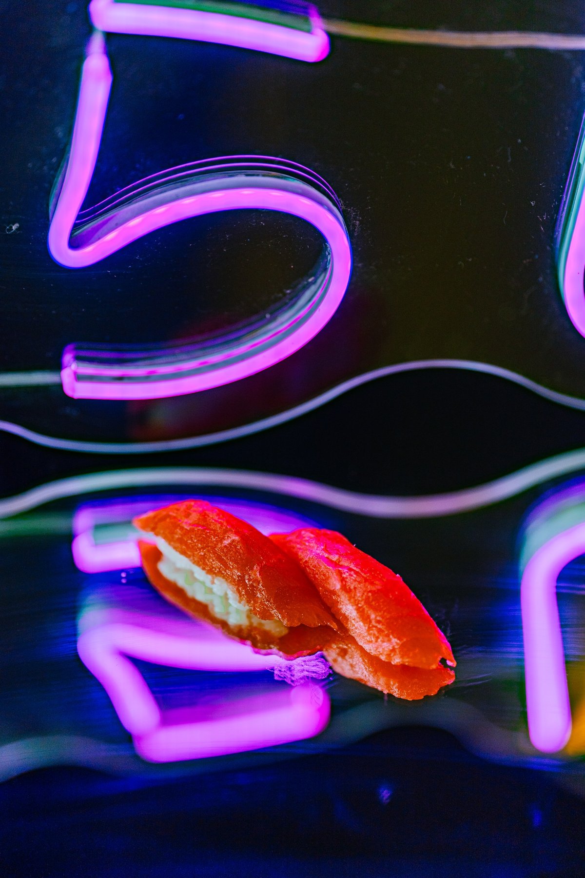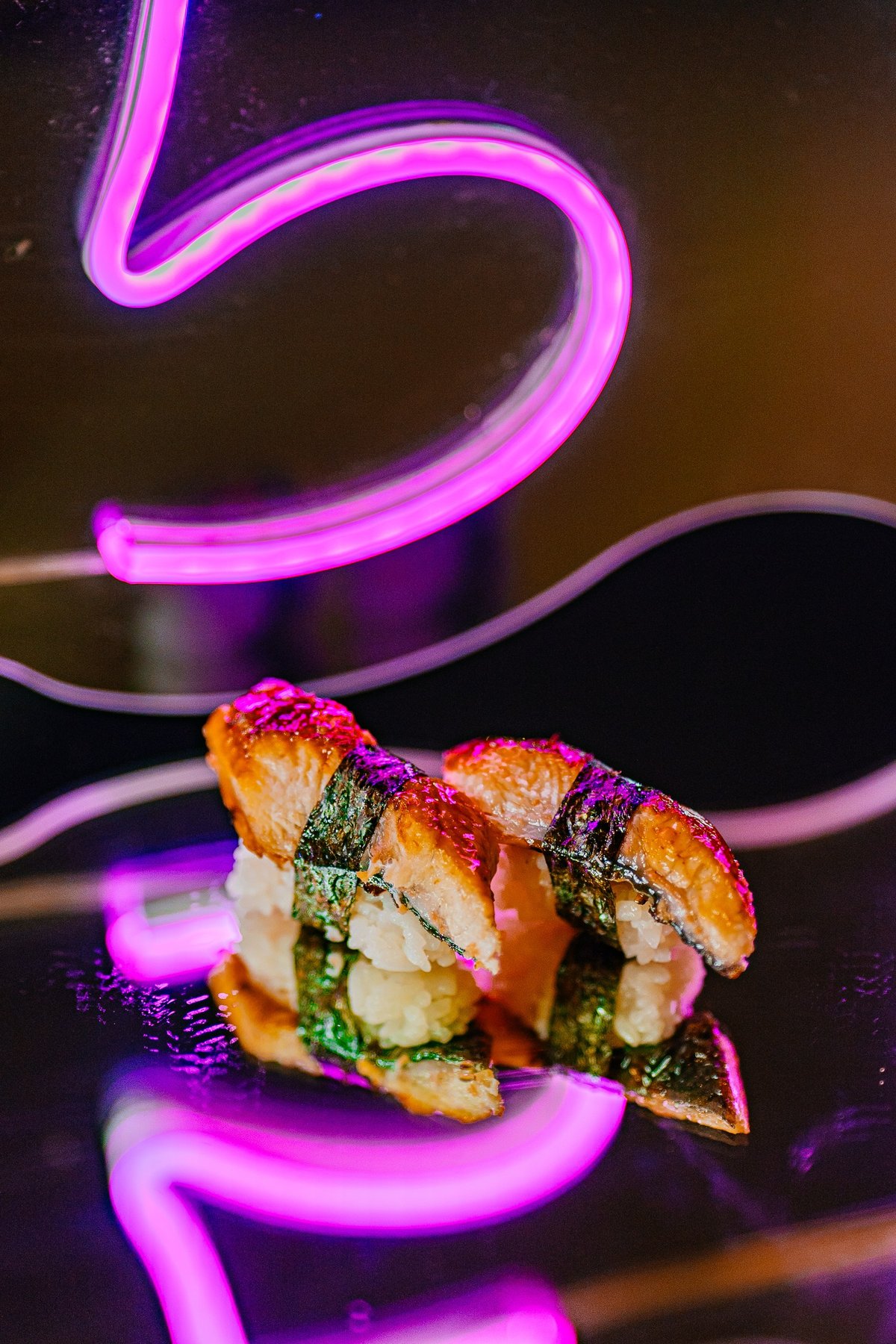 Sees: tempura krevett, avokaado. Peal: tuunikala tar-tar, unagi.
