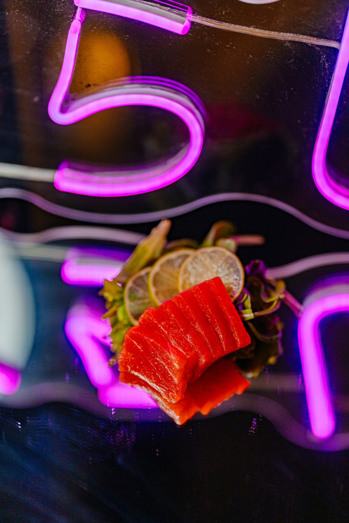 Sees: vürtsikas lumekrabi, kurk Peal: lõhe tar-tar, tuunikala, kammkarp