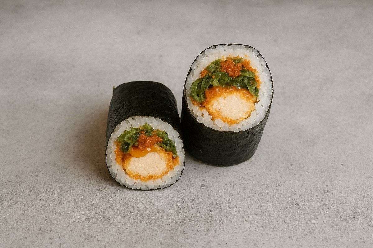 Tofu maki: tofu tempura, kanpyo, kurk, basiilik, roheline sibul, terav kaste, küüslaugu idud, tšilliniidid