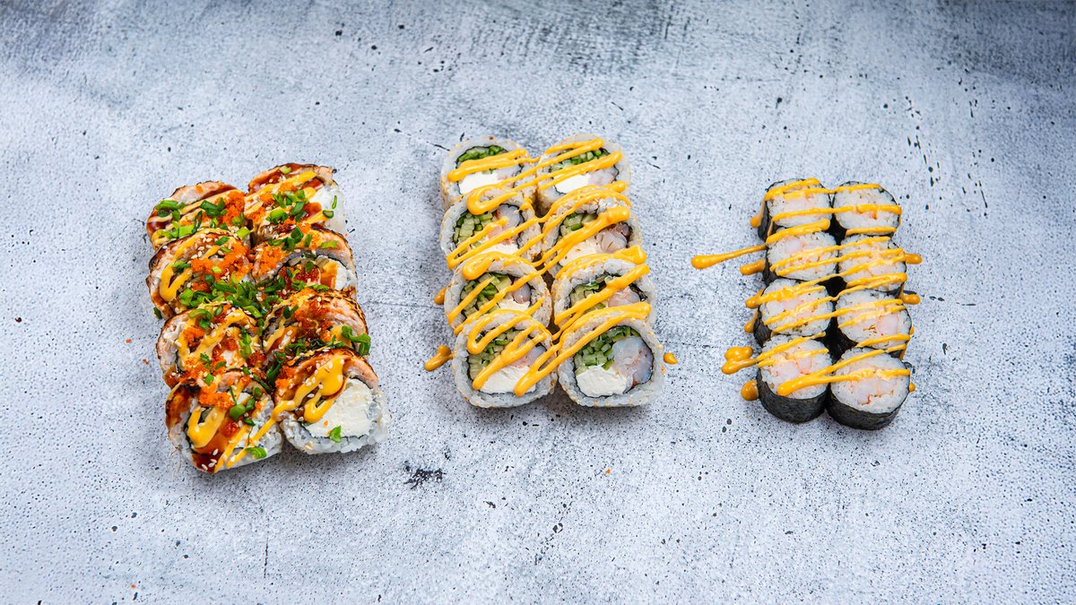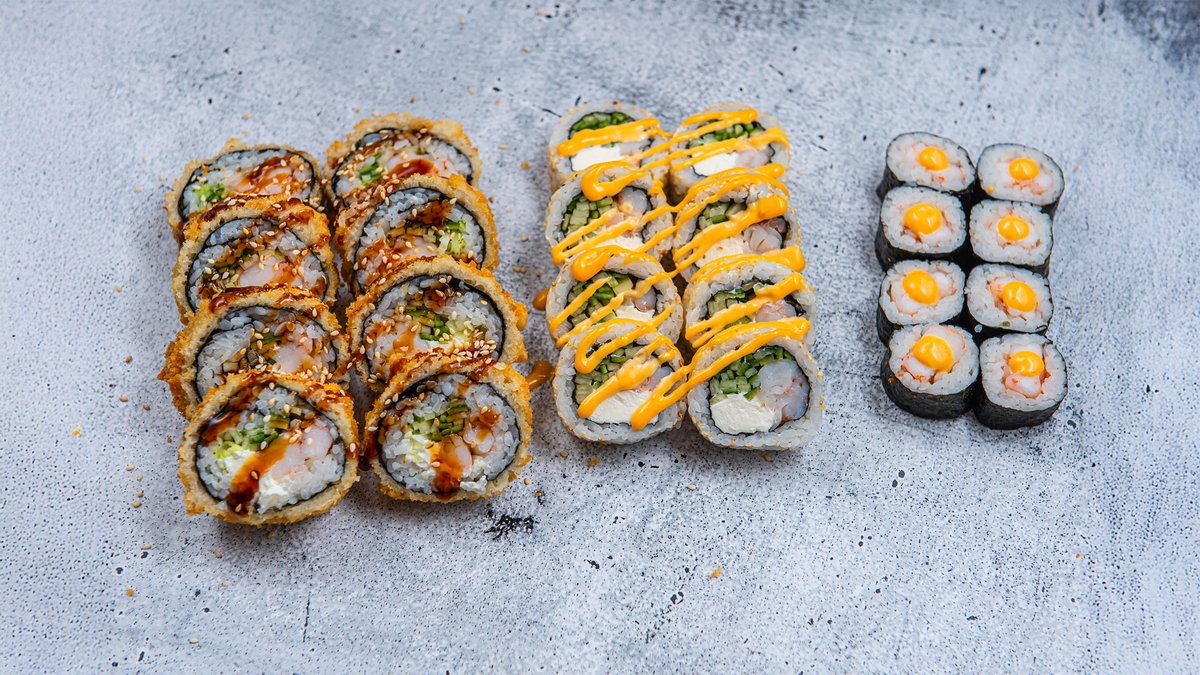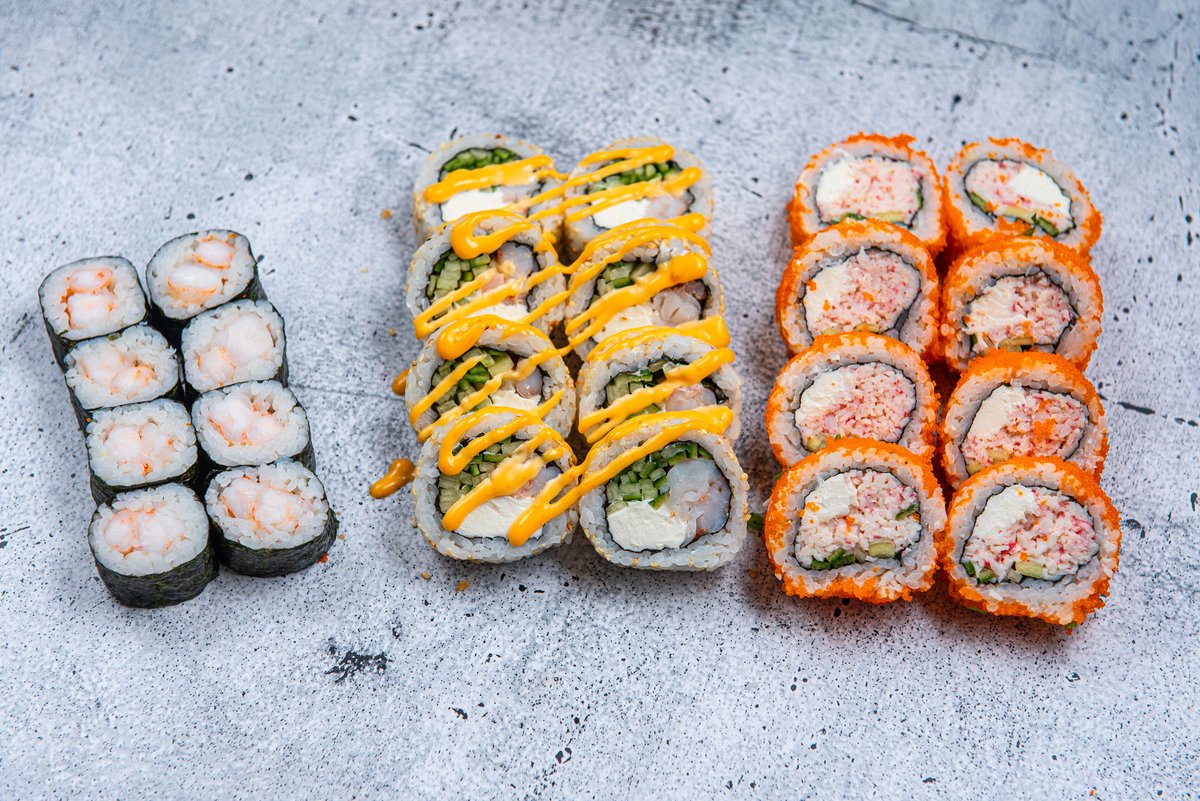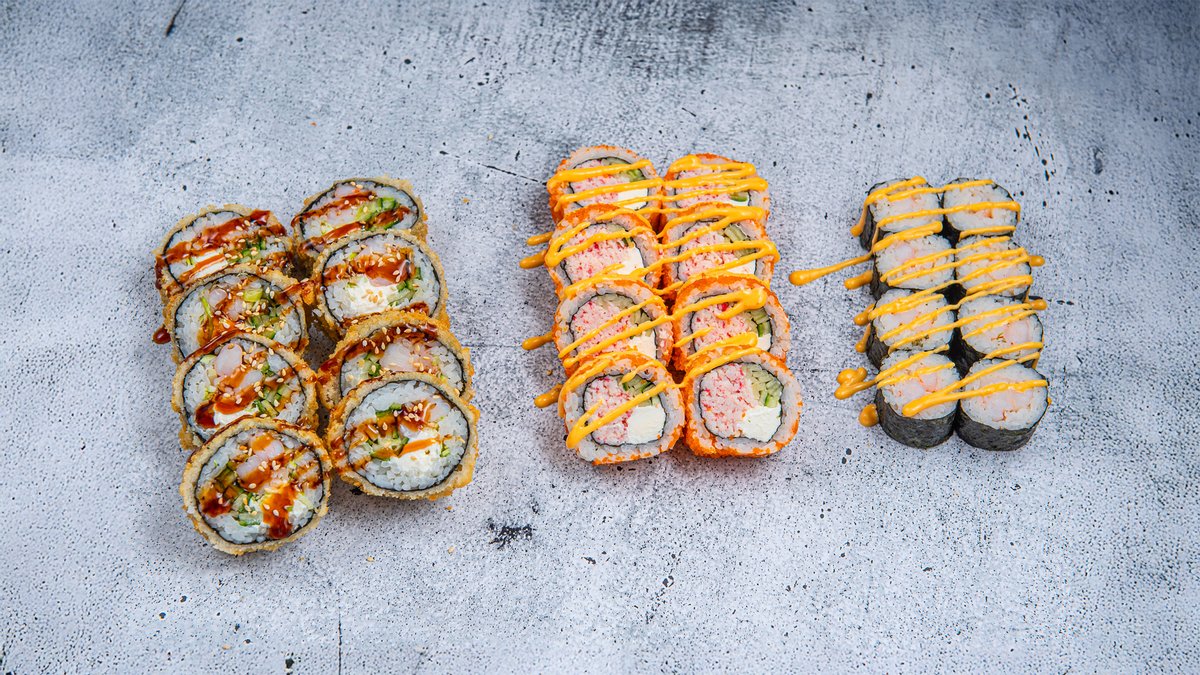 Flamed krab 8tk Ebi maki aioliga 8tk Hosomaki krevetiga 8tk