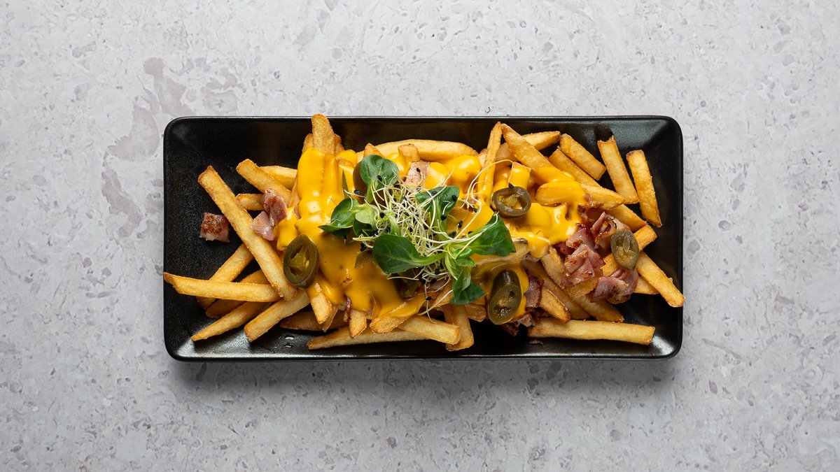 Laetud friikartulid peekoni ja cheddari juustukastmega