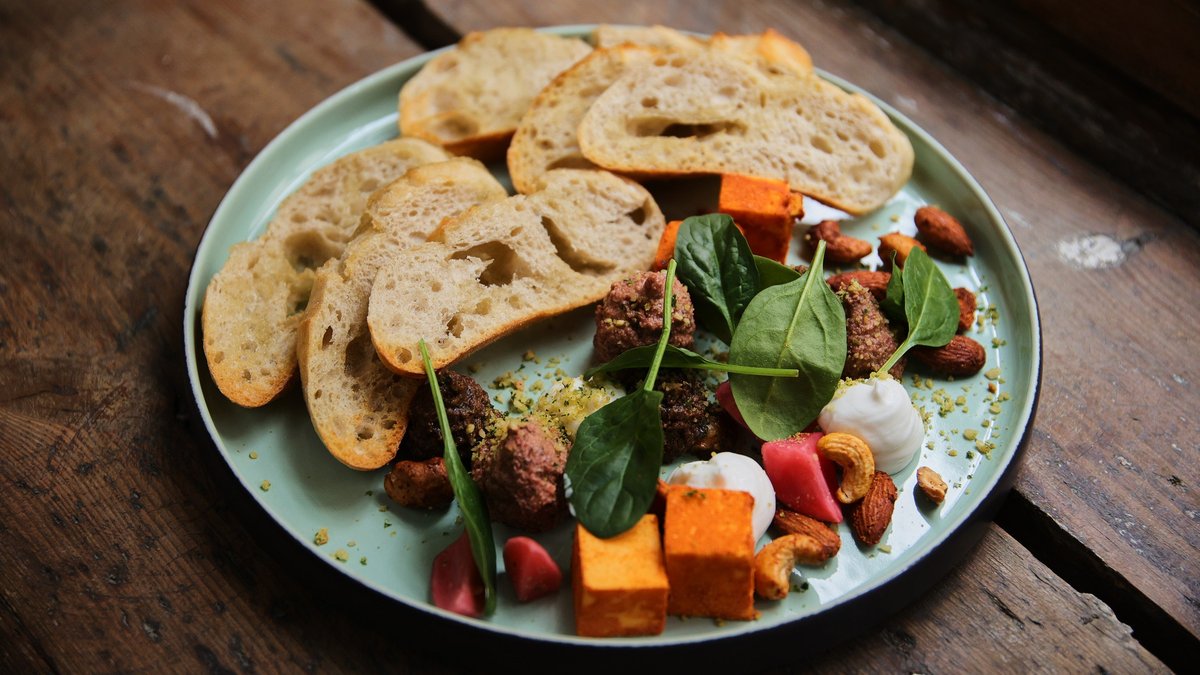 Snack platter: handcrafted cashew sheeses: chipotle pepper and truffle flavor, homemade jams: cognac-cranberry–orange, red wine onion–plum, pâté, rosemary bread, crackers, mixed nuts