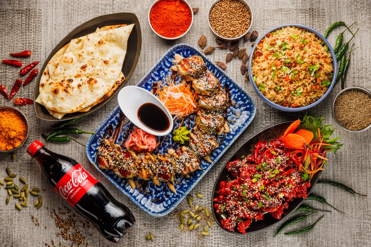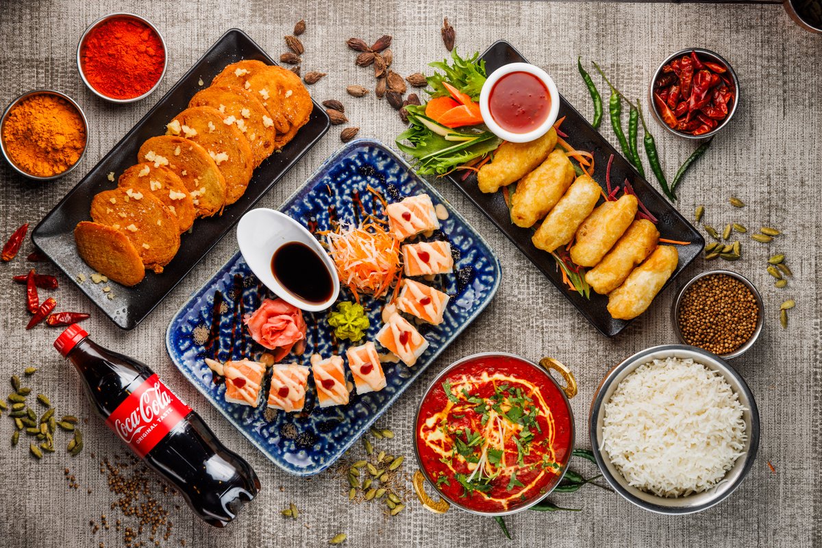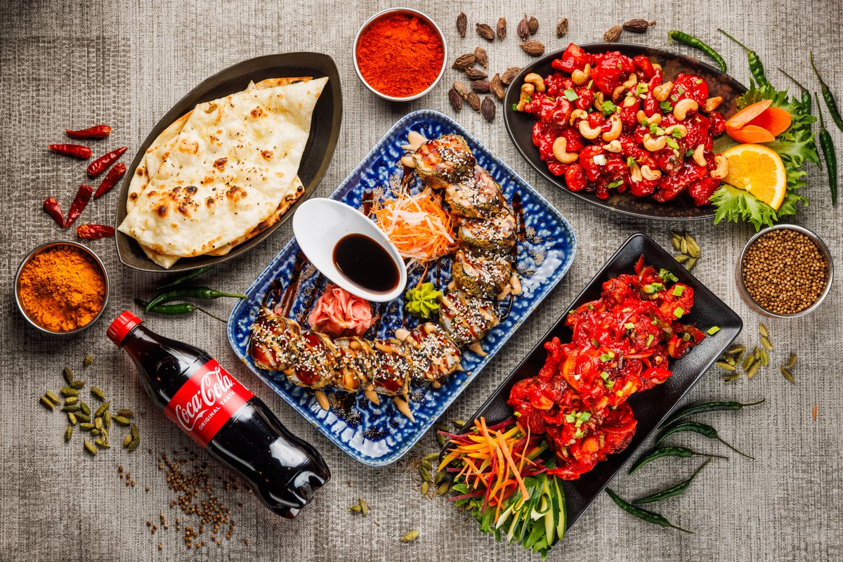 Itaalia pitsa india vürtsidega, burgerid, tempura, krõbekana ja salatid.