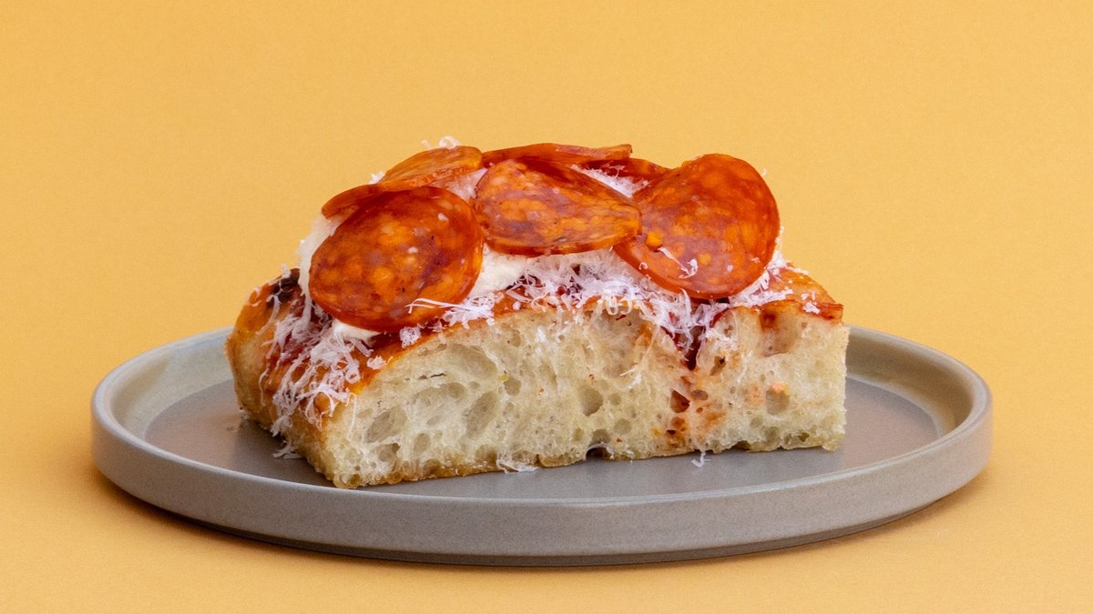 focaccia, tomatipüree, pepperoni, mozzarella, mesi, basiilik