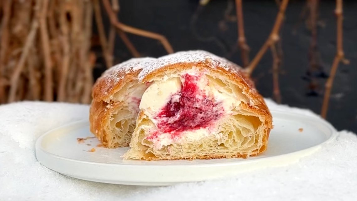 Cruffini legendaarne vastlacroissant toorjuustu-vahukoorekreemi ja vaarikamoosiga.