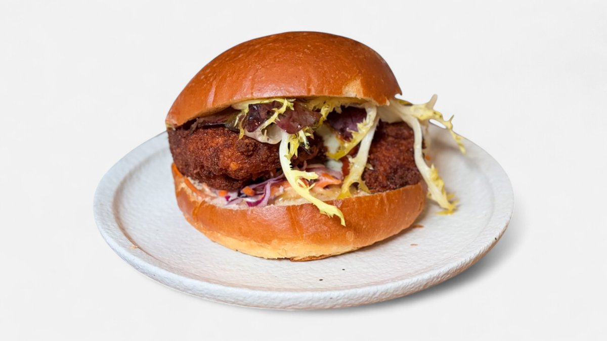 hapusaia paneeringus kana, brioche kukkel, frisee, coleslaw, sinihallitusjuustu kaste, tonkatsu kaste, röstitud küüslaugu majonees