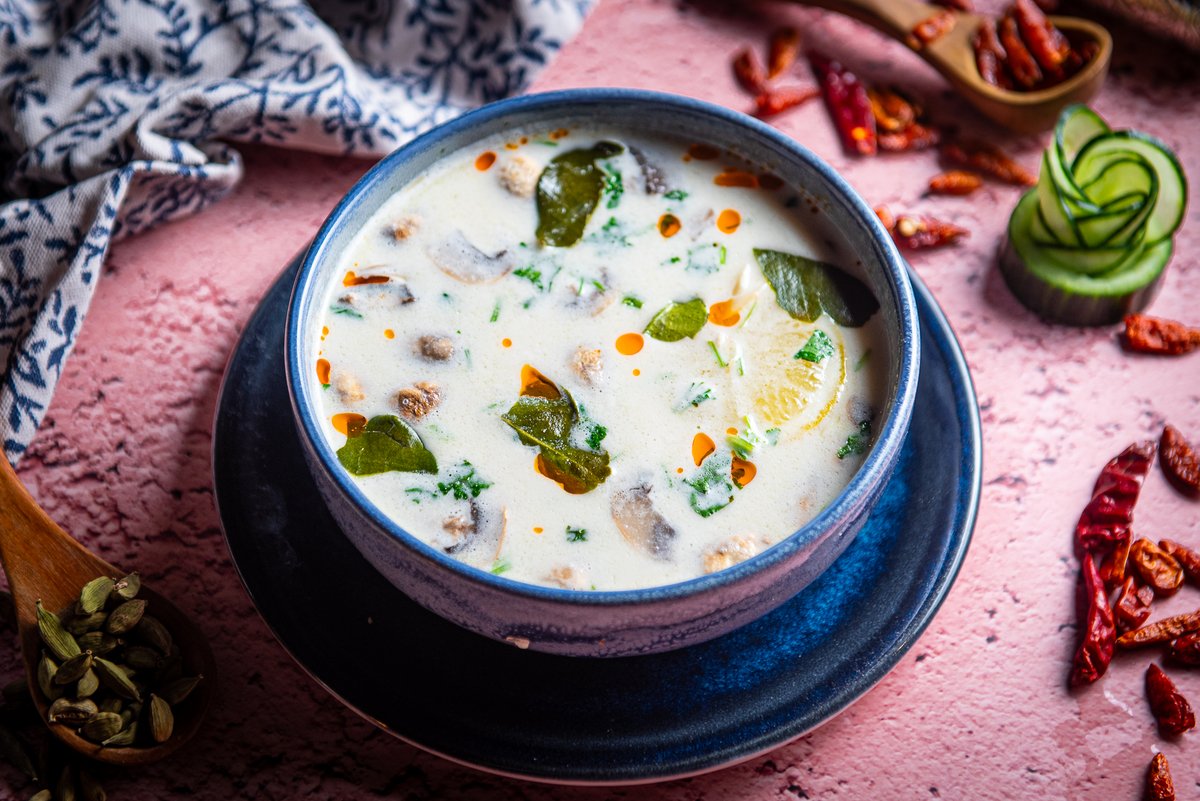 Vürtsine kookospiima supp kanaga koos seente, sidrunilehtede, sidrunirohu ja koriandriga Spicy coconut milk soup with chicken with mushrooms, lemon leaves, lemon grass and coriander Острый суп из кокосового молока с курицей с грибами, листьями лимона, лемонграссом и кориандром
