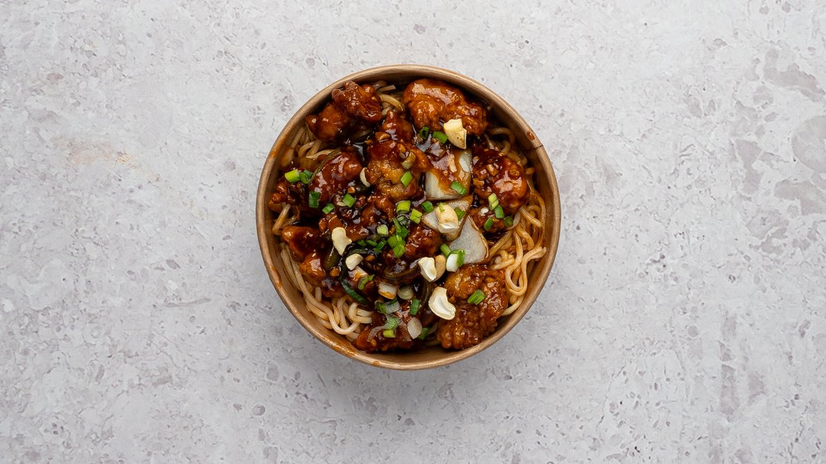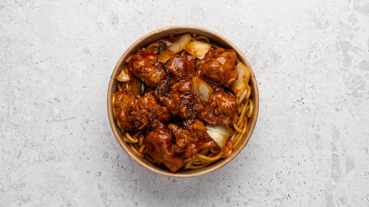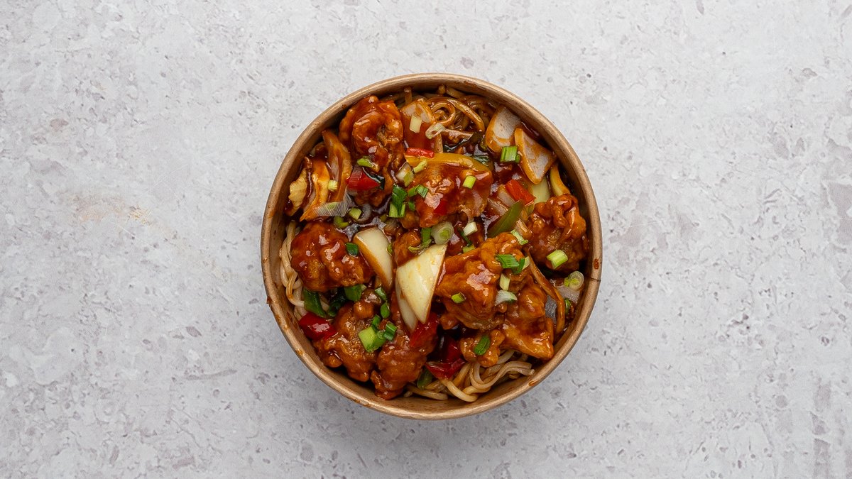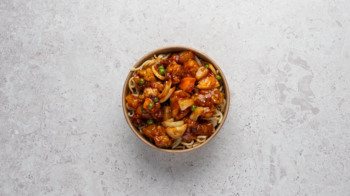 Muna nuudlid, krõbekana, porgand, kapsas, küüslauk, muna, paprika, sibul, roheline sibul, sojakaste, kung pao kaste