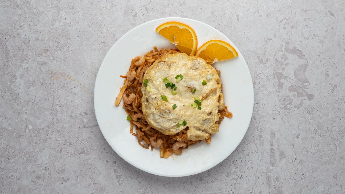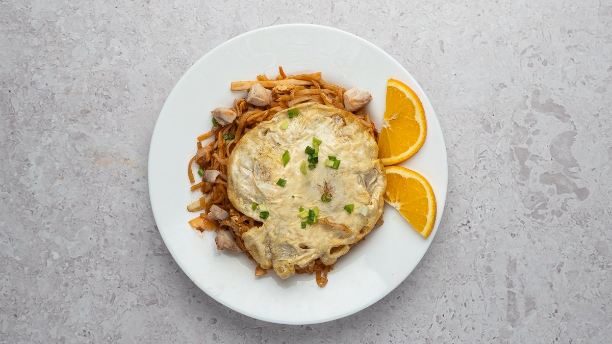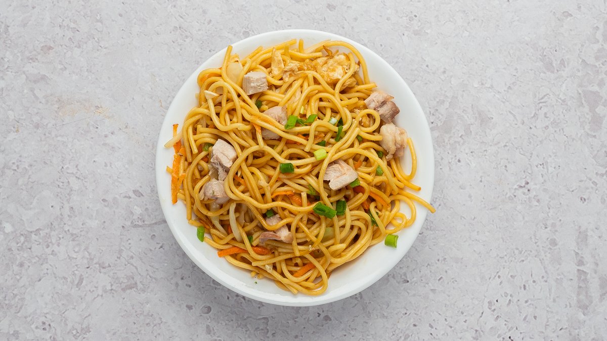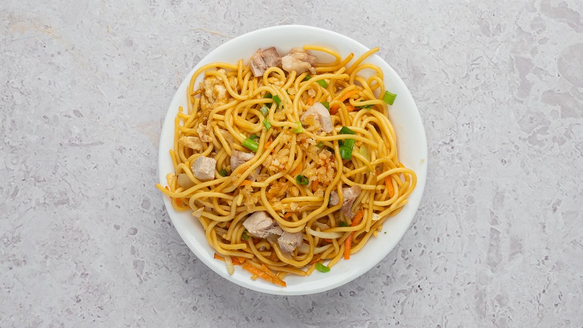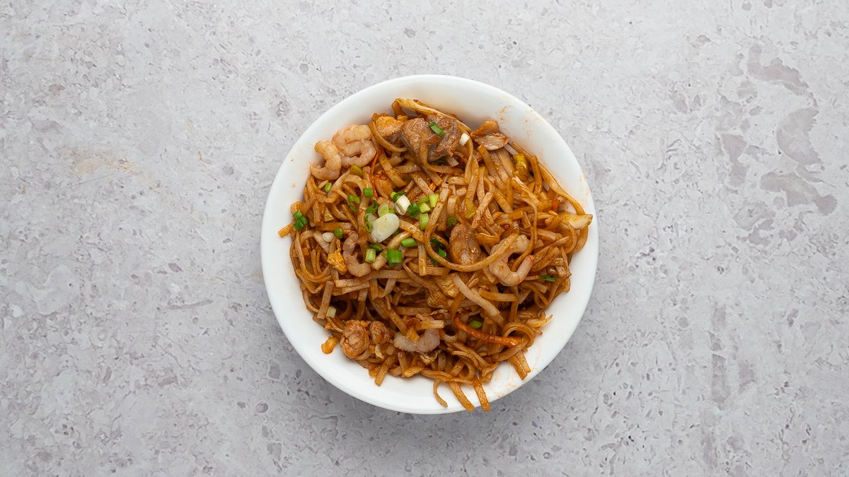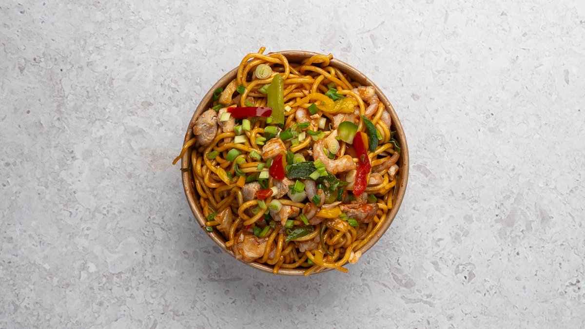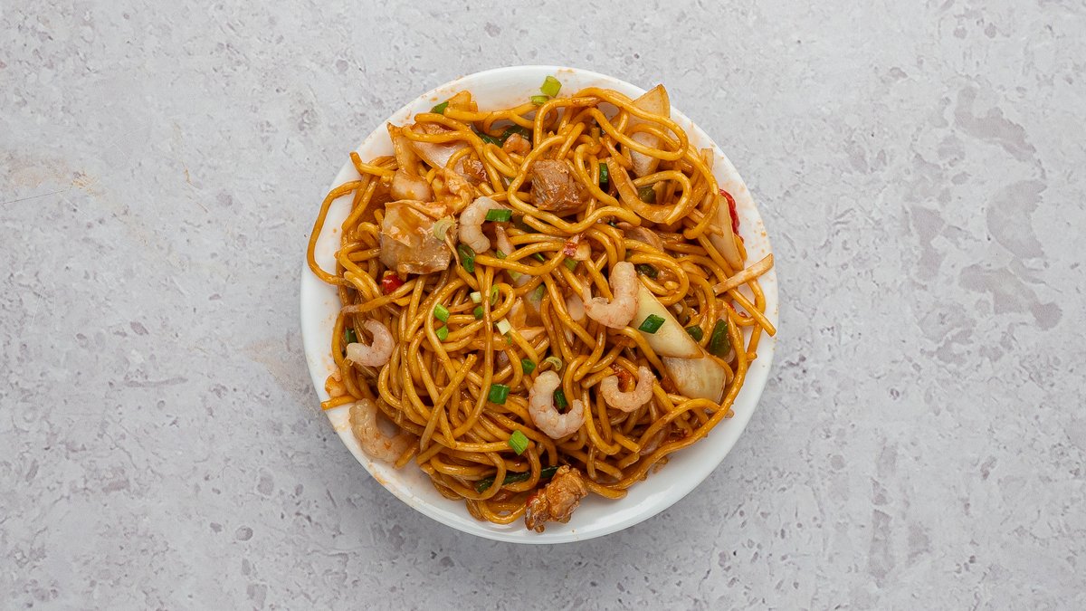 Nuudlid, kanaliha, krevetid, porgand, kapsas, küüslauk, muna, paprika, sibul, roheline sibul, sojakaste, tšilli-küüslaugu kaste