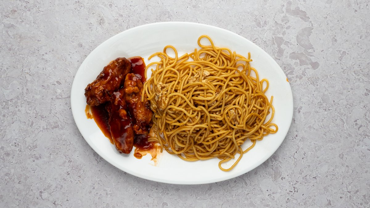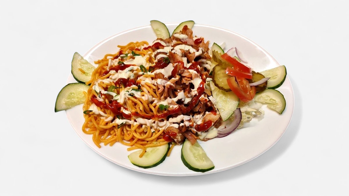 Kebab plate - kebabi liha, friikartulid, hiina kapsas, kurk, hapukurk, punane sibul, tomat Meekandja munanuudlitega- Munanuudlid, krõbekana, porgand, kapsas, muna, sojakaste, seesami seemned, meekaste