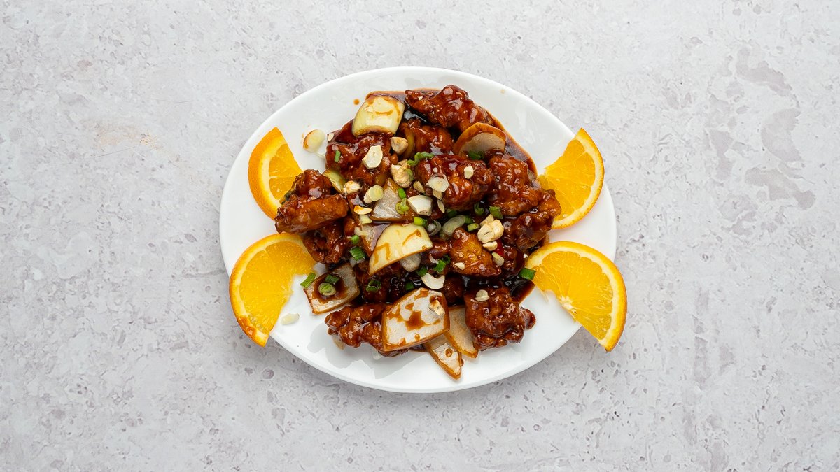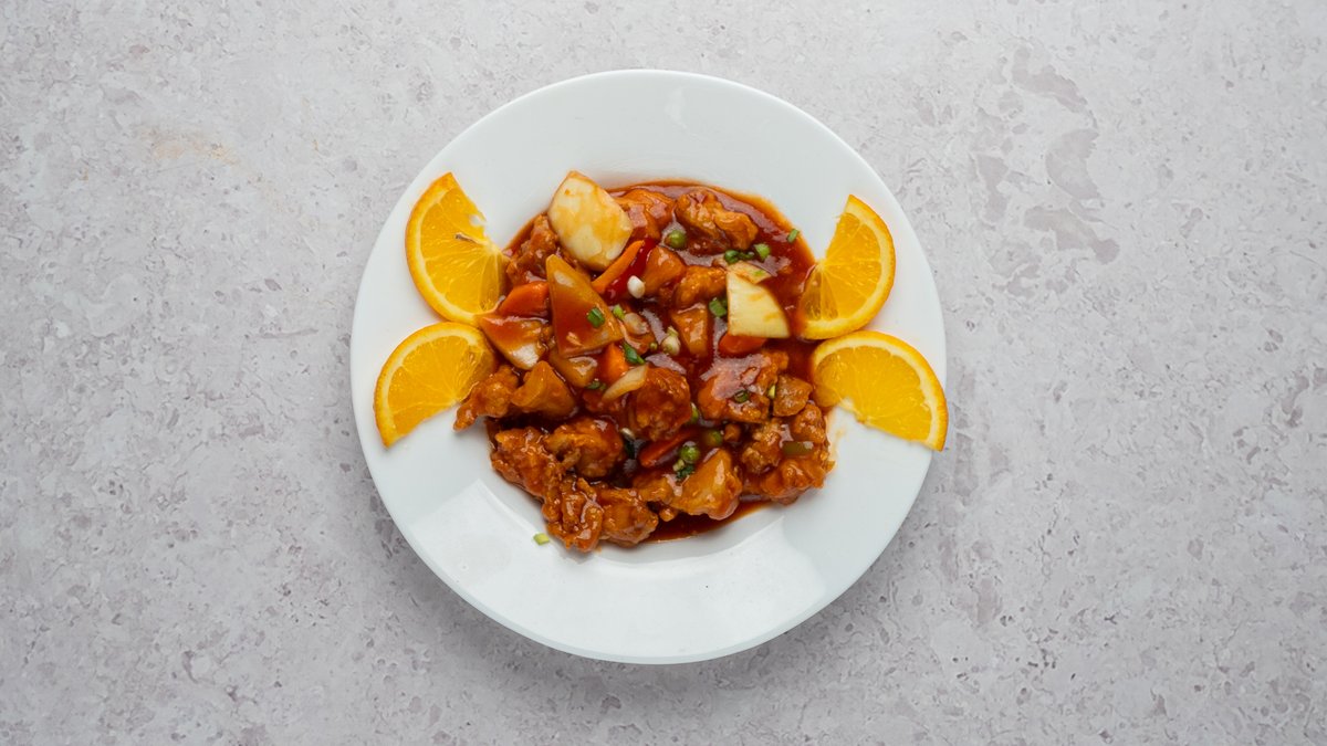 Krõbedaks praetud kana ananassidega apelsinikastmes.
