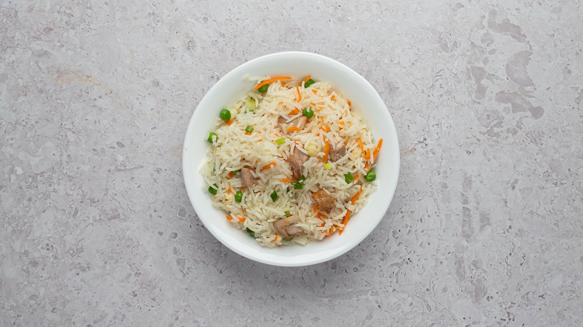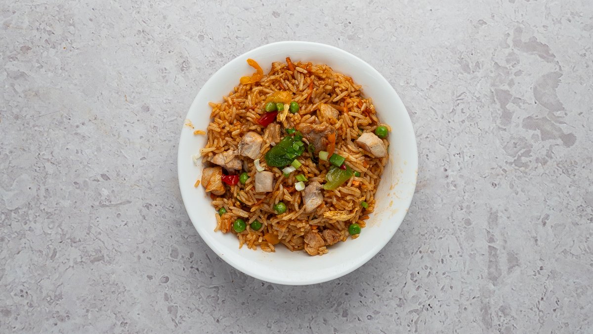 Praetud riis küüslaugu, tšilli, muna ja kanalihaga
