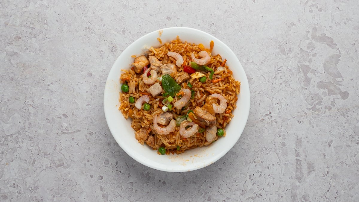 Tšilliga ja küüslauguga riisi kanaliha, krevettide, juurvijade ja munaga