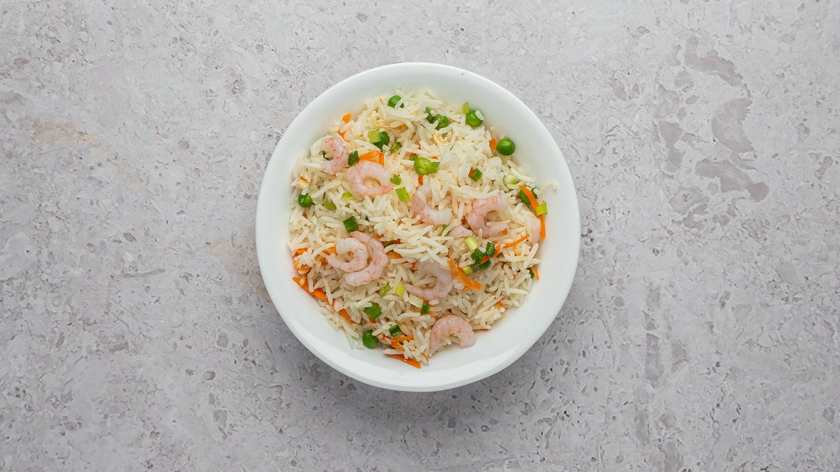 Praetud riis krevetidega, köögiviljade ja munaga