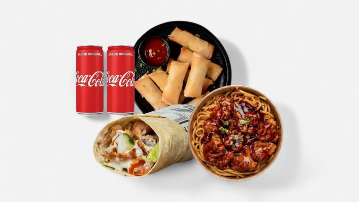 Keskmine kebab wrap+ Chef peking kana wok nuudlid🌶️+ 8 tk mini kevadrull ja kaste+ 2 vaike jook