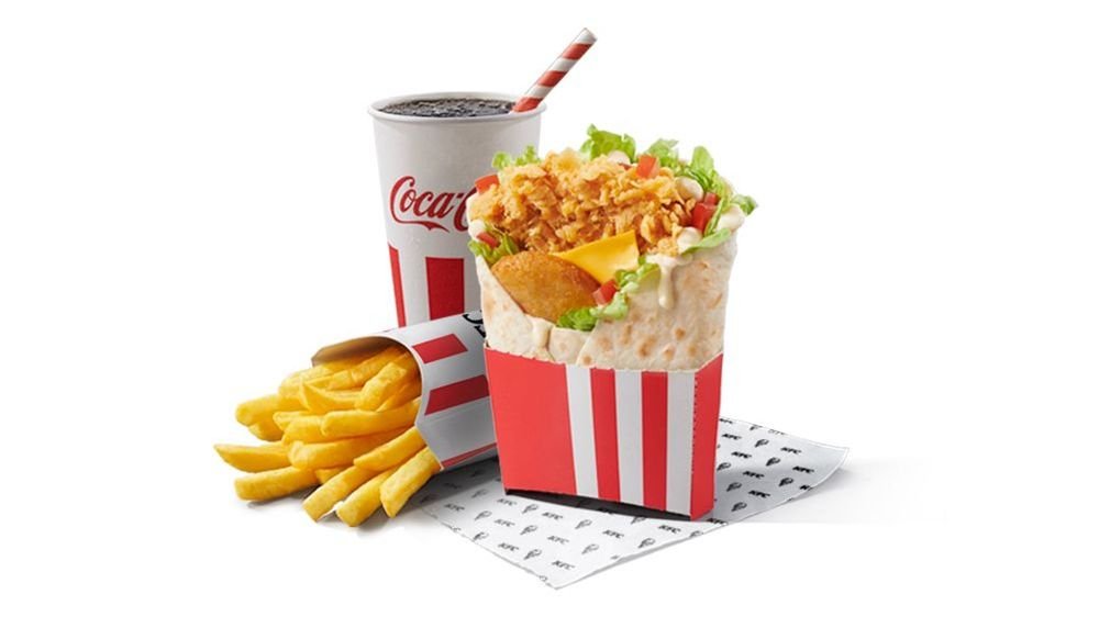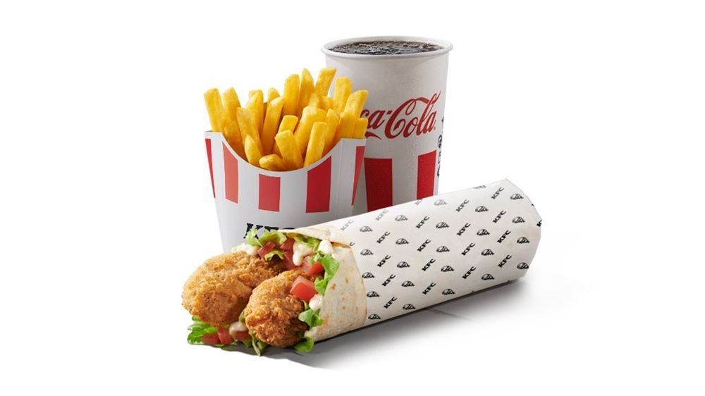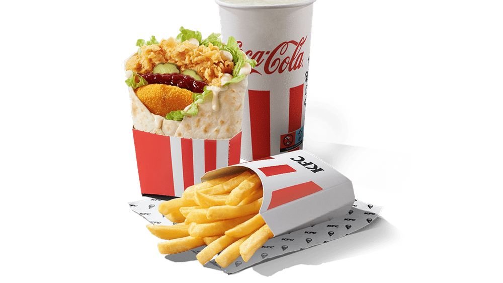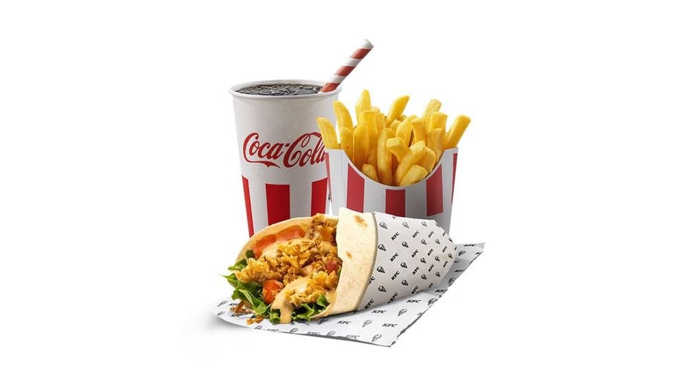 Kaks krõbedat kanafileeriba, salat, tomat ja majonees. Kõik see on rullitud maitsvaks röstitud tortillaks. Twister tortilla, suured friikartulid, suur jook 0,5l