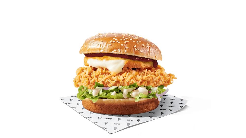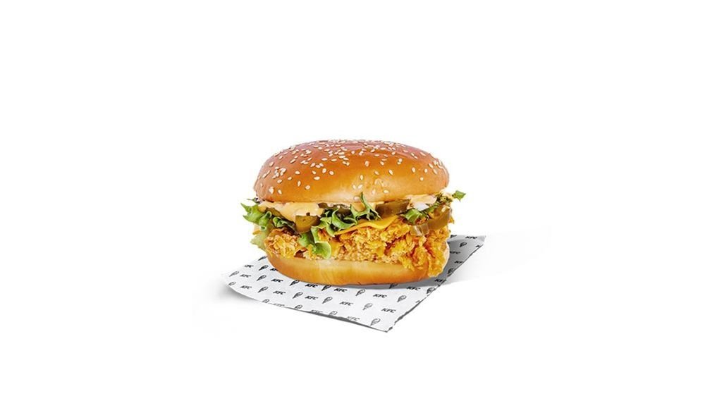 Originaalretsepti järgi valmistatud kanafilee või vürtsikas Zinger kanarind, Cheddar juust, marineeritud kurk, salat, burgerikaste ja vürtsikas Jalapeno.