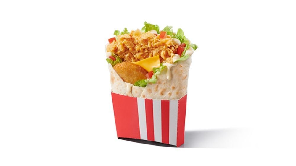 Täielik laeng! Mahlane kanarind, cheddar juust, röstitud kartulikotlett, värsked tomatid, krõmpsuv salat ja majonees - kõik see on rullitud maitsvaks tortillaks.