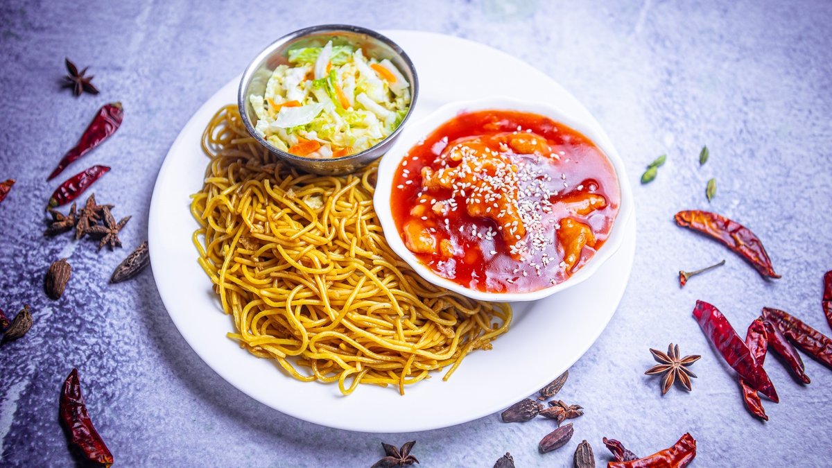 7000. Crispy Chili Chicken with Egg Vegetable Noodles