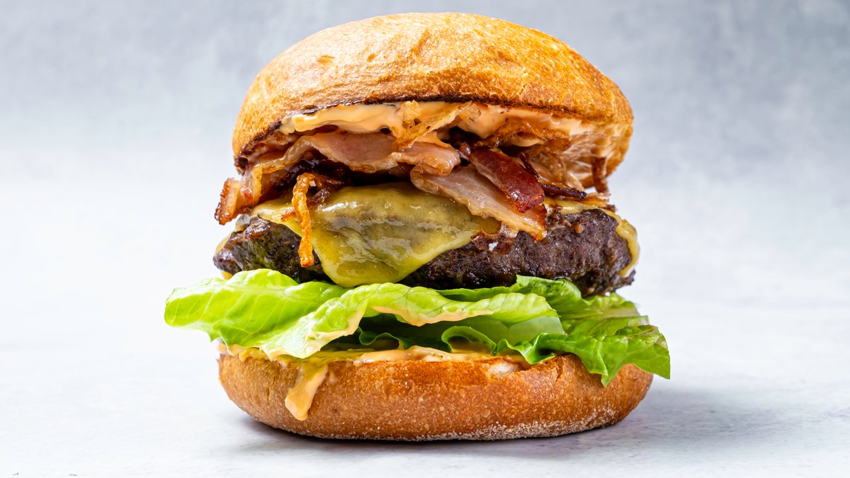 Burger veiseliha, peekoni, hamburgerikastme, praesibula, lehtsalati, cheddari ja O´Learyse BBQ kastmega