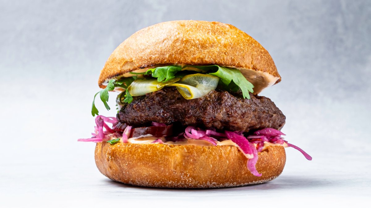 Veganburger, vegan majonees, marineeritud punane sibul, vegan cheddar juust ja jalapenod