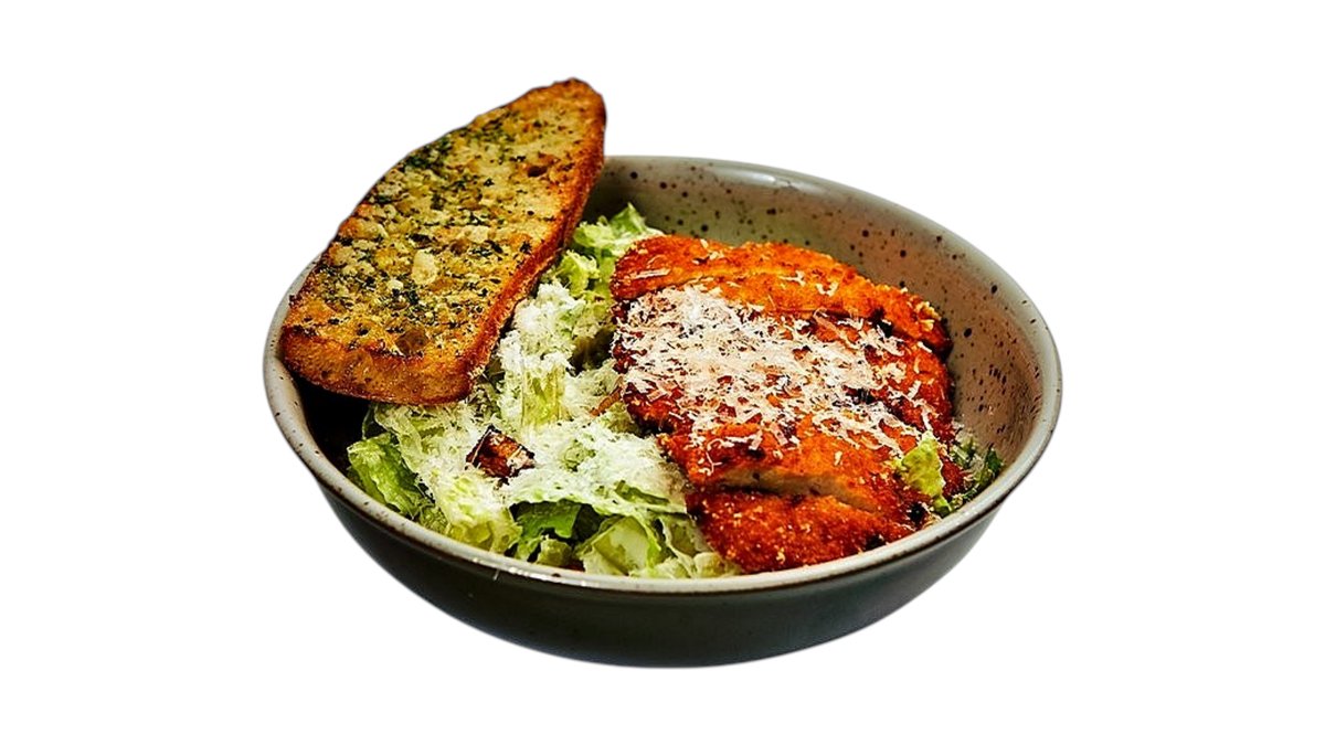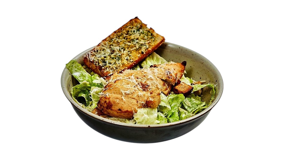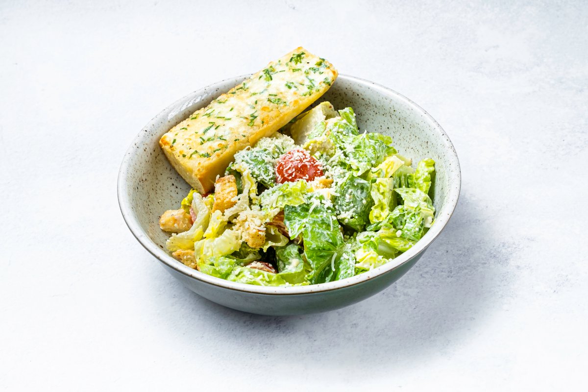 Klassikaline Caesari salat tomatite, krutoonide, Rooma salati, kõvajuustu ja Caesari kastmega. Serveeritakse krõbeda küüslaugusaiaga