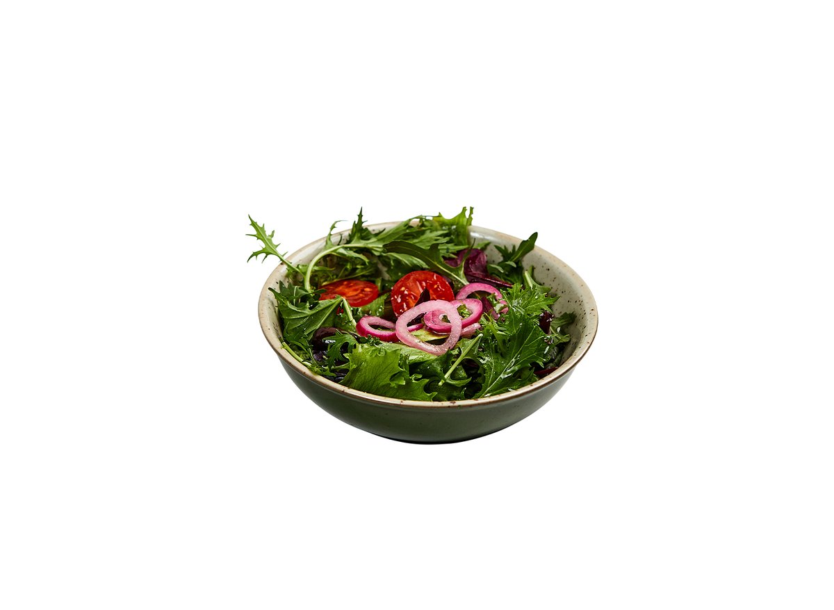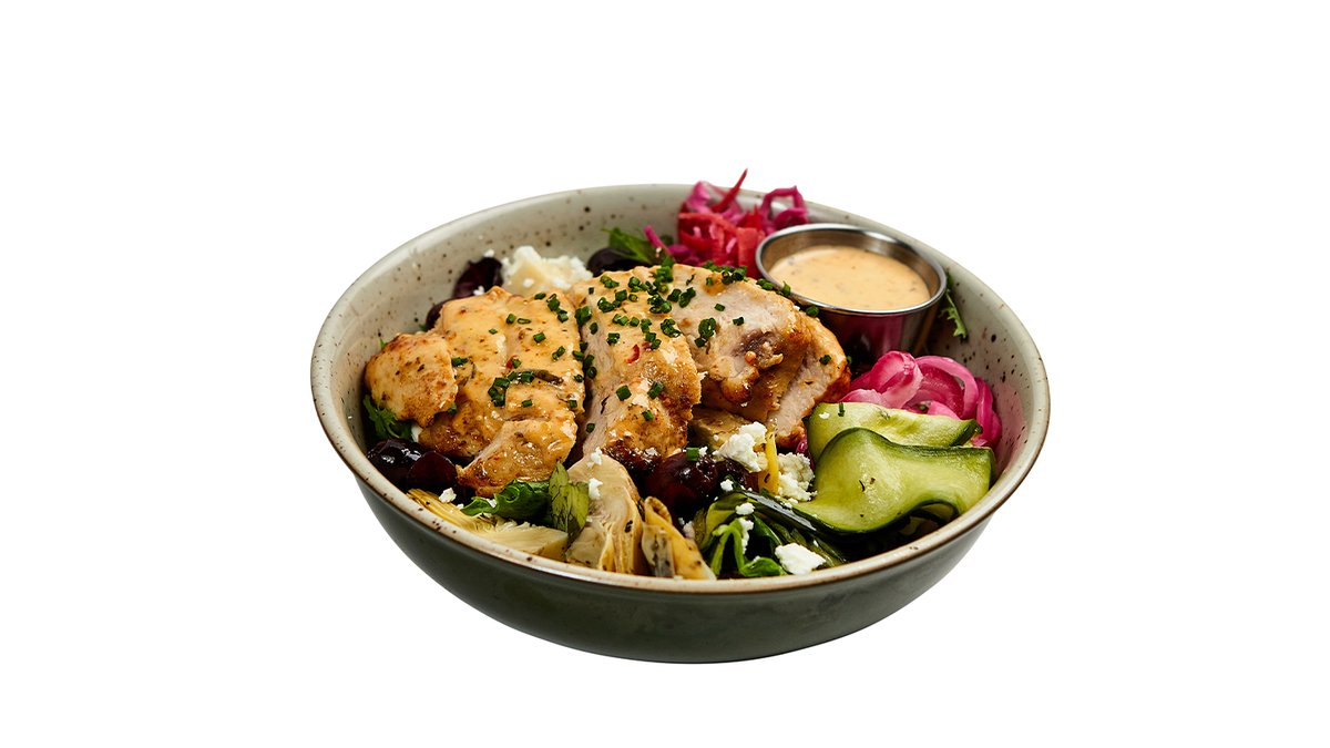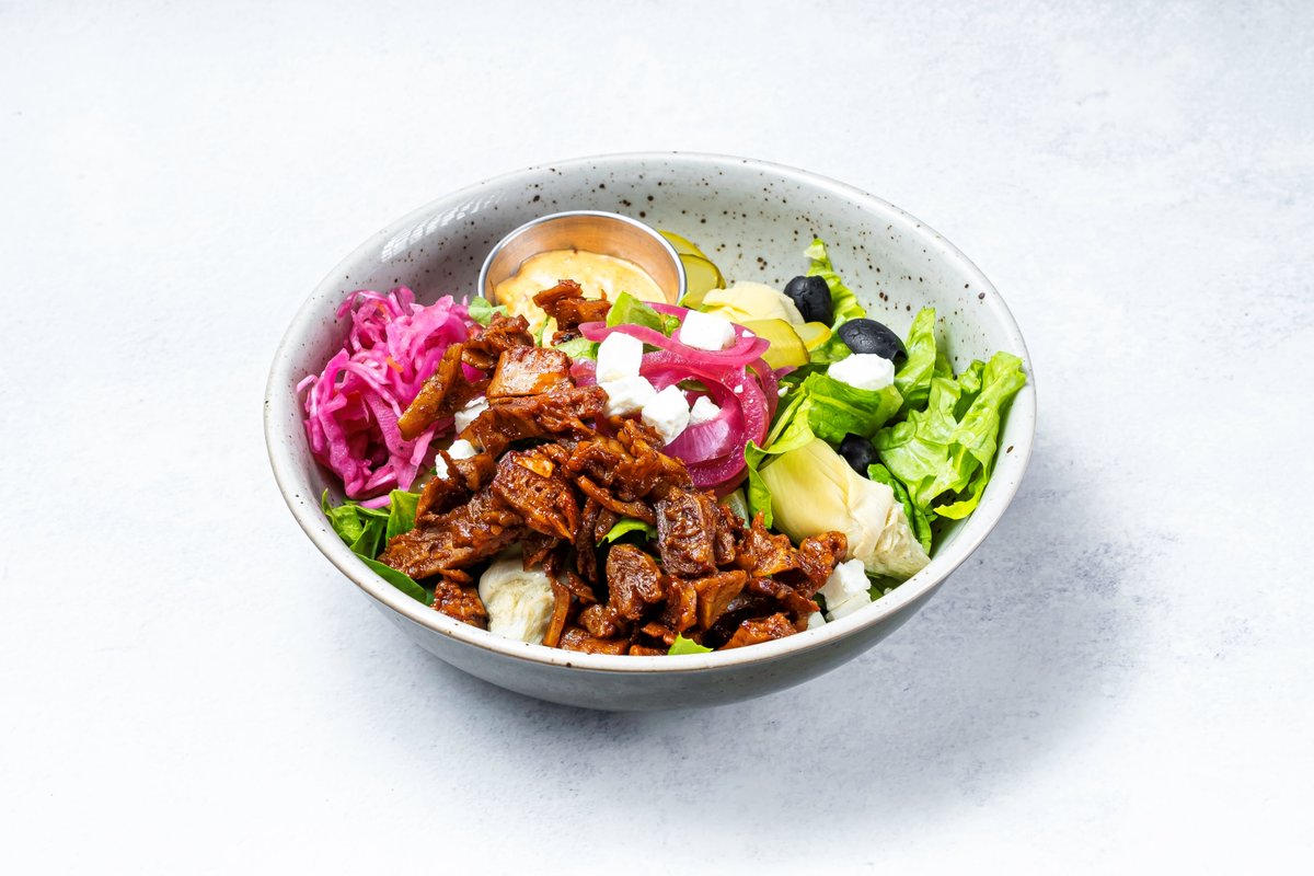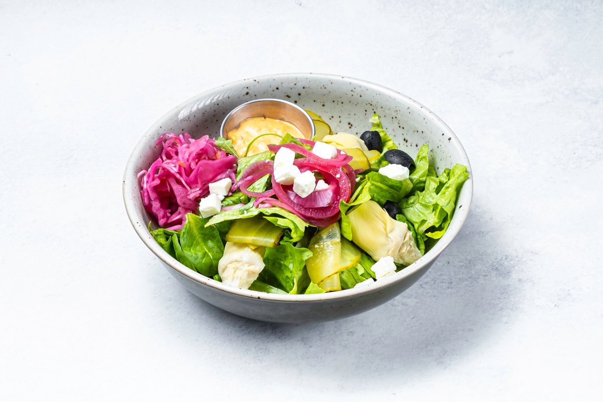 Salat artišoki, feta juustu, salatimixi, jalapeno, vürtsika marineeritud jalapeno-kapsasalati, marineeritud kurgi, mustade oliivide, marineeritud sibula ja parmesani- küüslaugukastmega