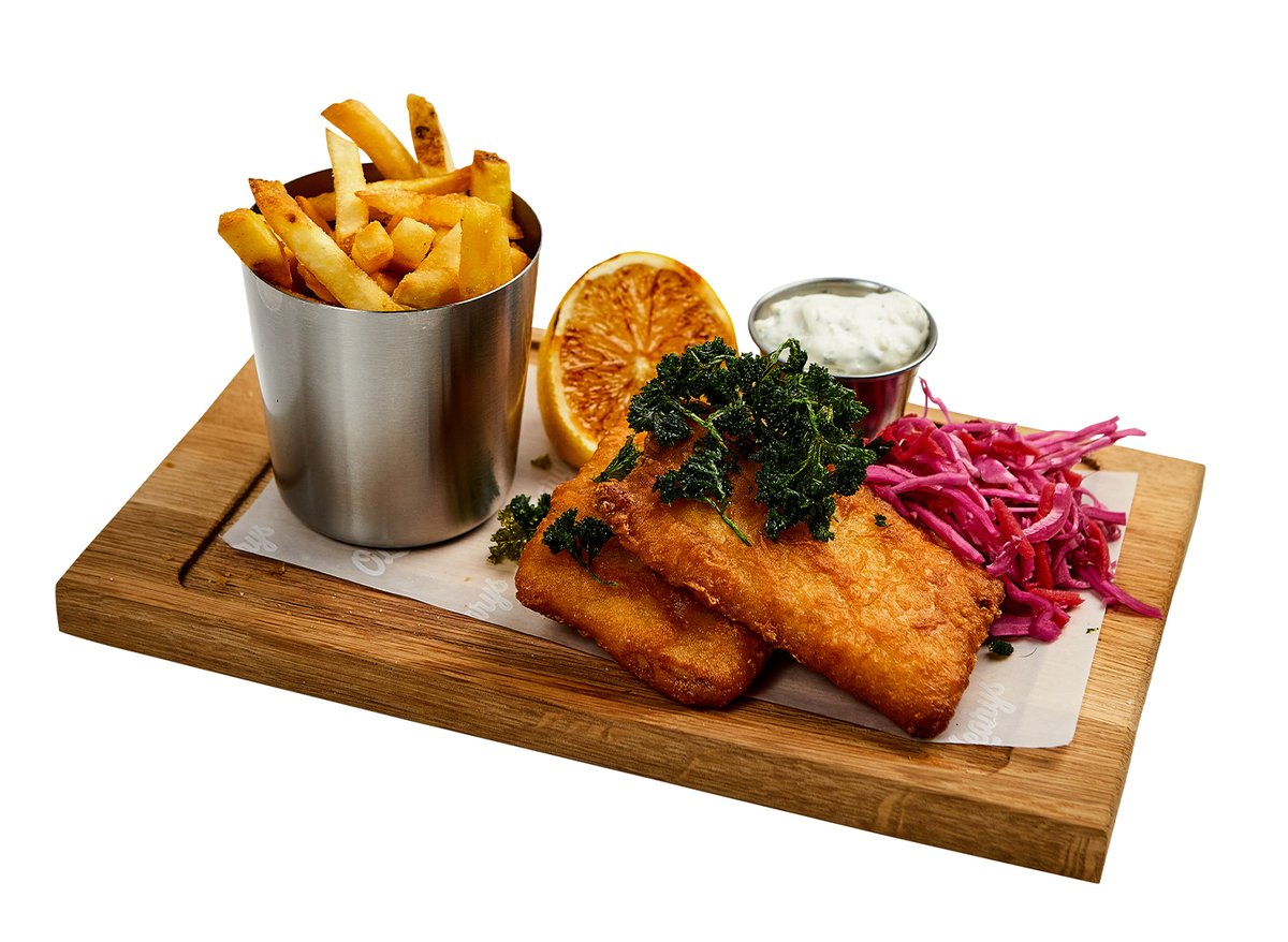 Paneeritud tursafilee tartar kastme, grillitud sidruni, vürtsika marineeritud jalapeno-kapsasalati, frititud peterselli ja friikartulitega.