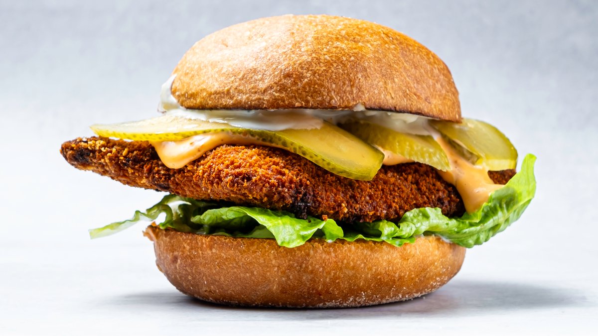 Burger krõbekana, sinihallitusjuustukastme, marineeritud kurgi, vürtsika buffalo kastme ja lehtsalatiga. Serveeritakse marineeritud kurgi ja friikatega